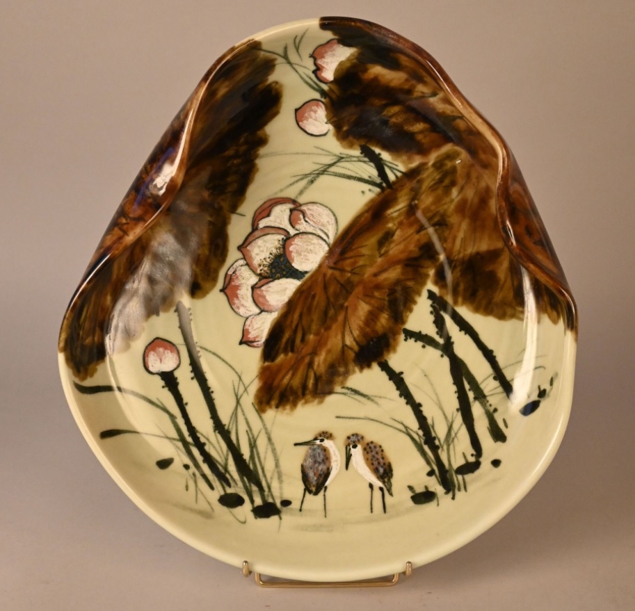 Large dish with a rim folded, for ikebana or decoration. Porcelain, with polychrome enamel decoration of two wading birds beneath flowering lotus. Length 35 cm. Japan, 20th century