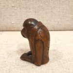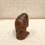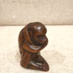 Netsuke – Amusant modèle d’un petit singe, représenté assis, ses pattes arrières se joignant. Il est vêtu d’une longue veste richement orné, portant sa main à sa bouche. Himotoshi au dos. Belle finesse de sculpture. Dimensions : 4 x 2,5 cm. Japon fin Edo (1603-1868) début Meiji (1868-1912) XIXe siècle, vers 1860-1880.