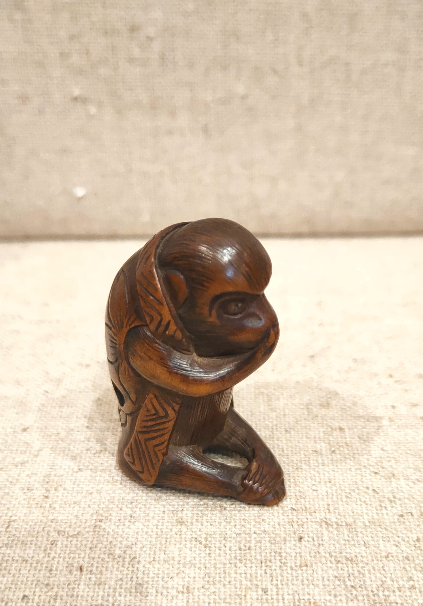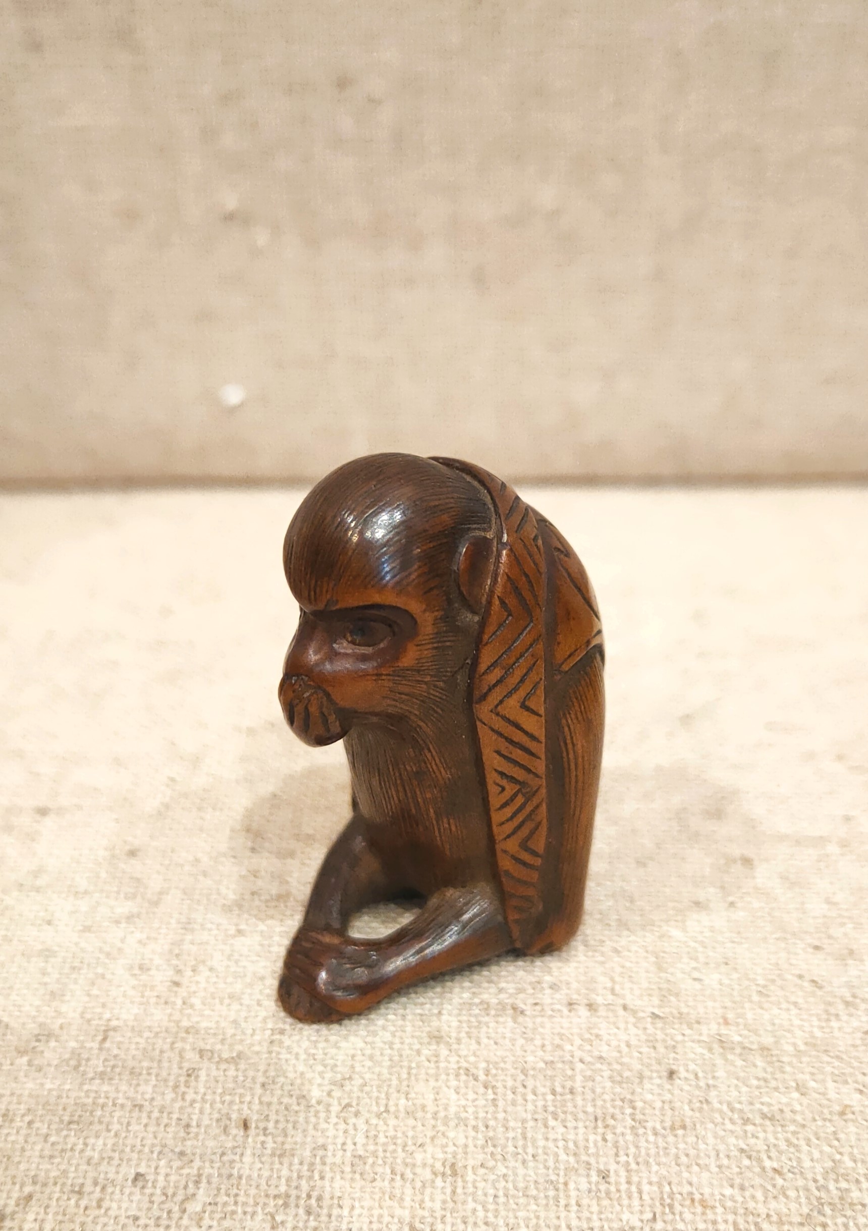Netsuke – Amusant modèle d’un petit singe vêtu, représenté assis. Edo, début Meiji
