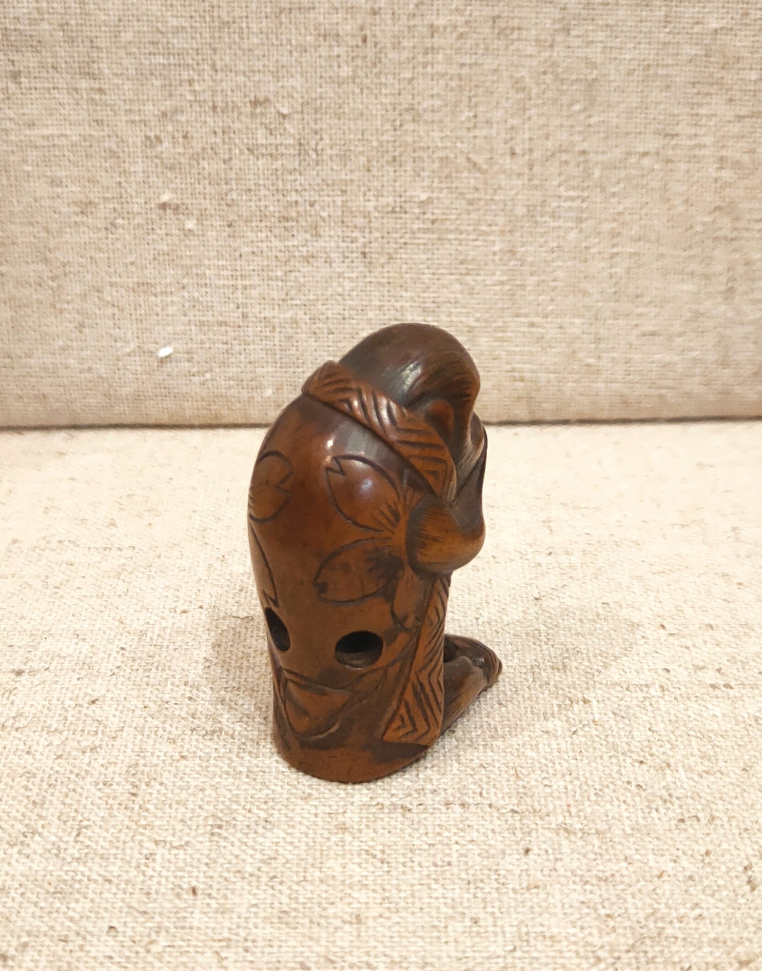 Netsuke – Amusant modèle d’un petit singe, représenté assis, ses pattes arrières se joignant. Il est vêtu d’une longue veste richement orné, portant sa main à sa bouche. Himotoshi au dos. Belle finesse de sculpture. Dimensions : 4 x 2,5 cm. Japon fin Edo (1603-1868) début Meiji (1868-1912) XIXe siècle, vers 1860-1880.