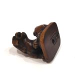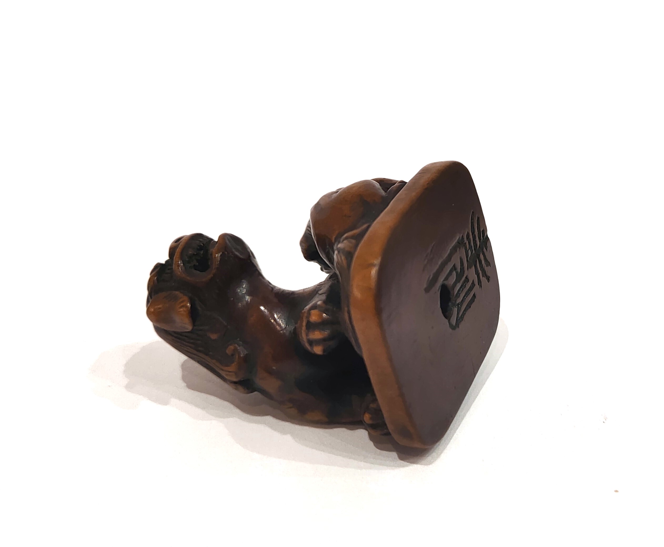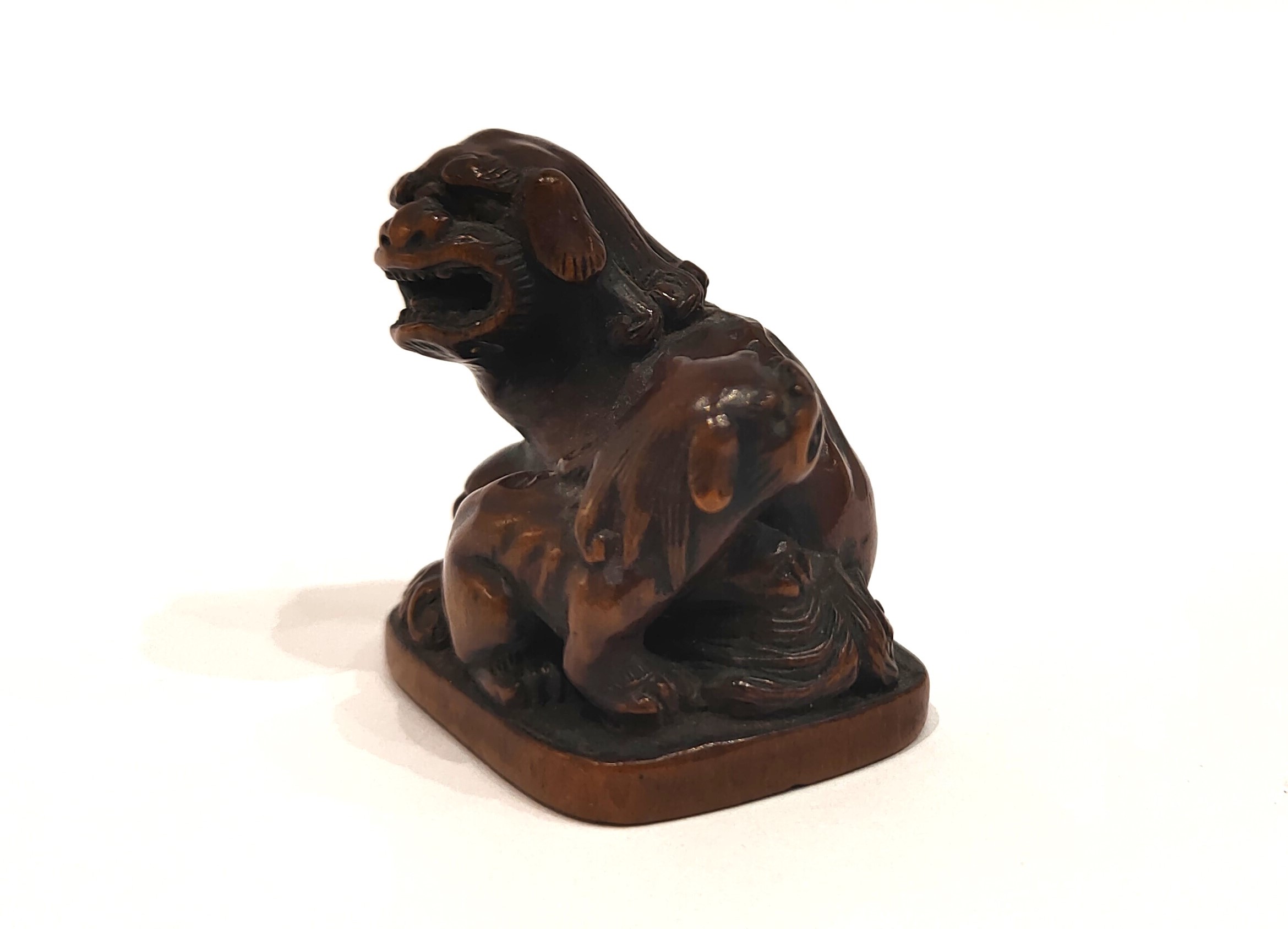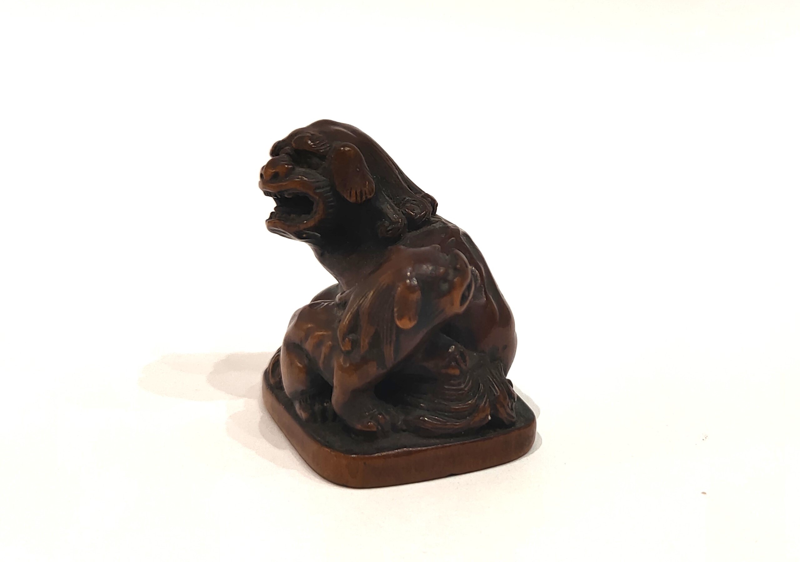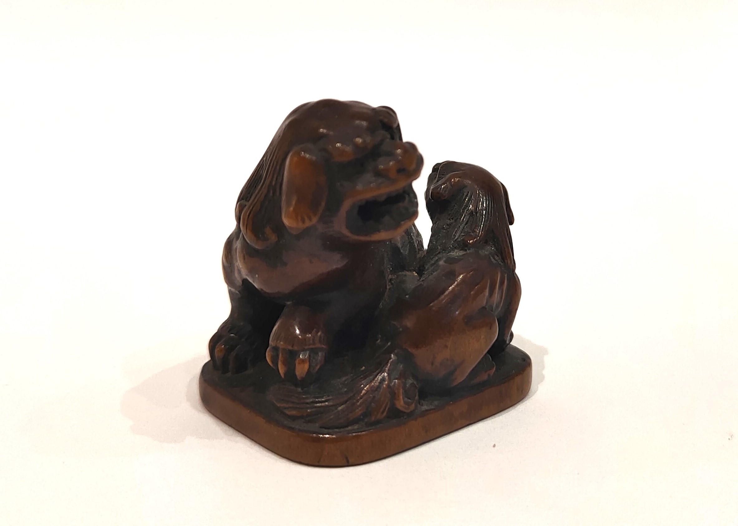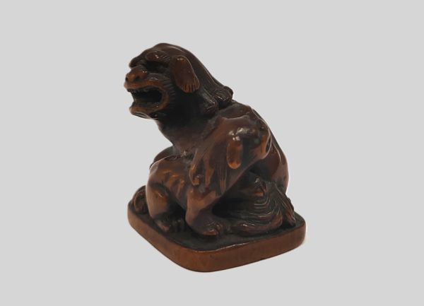 Netsuke – A woodbox model of two Shishi, seated on a terrace. Fine details of sculpture. Beautiful patina. Signed under the base. Dimensions : 3 x 3,5 cm. Japan Edo (1603-1868) 19th century.