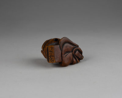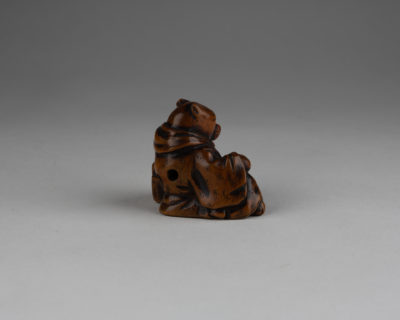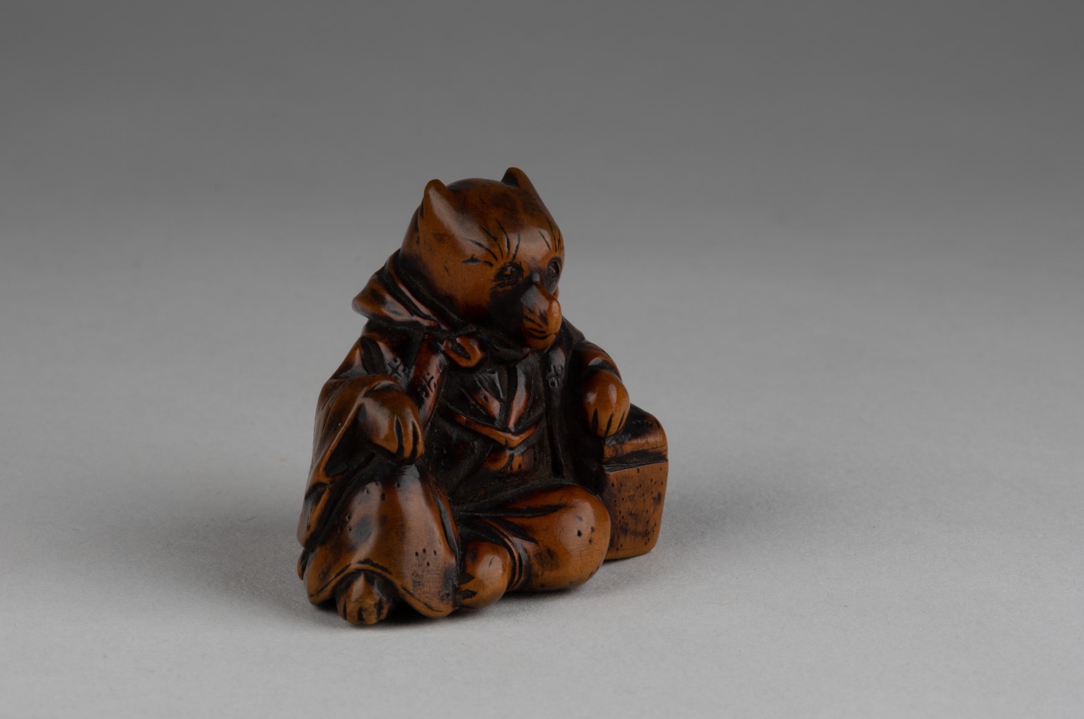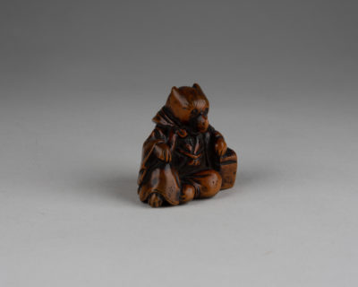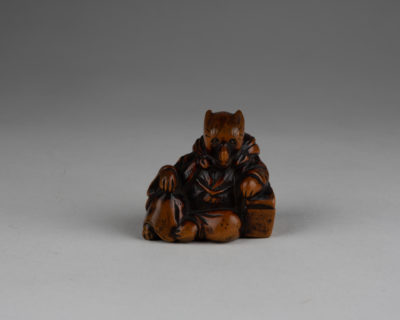 Netsuke – Joli modèle représentant un renard, en japonais Kitsune, en bois sculpté, représenté assis, vêtu d’un long manteau, déguisé en prêtre, accoudé sur un socle sur lequel repose un livre ouvert. Joli modèle avec une belle patine naturelle. Himotoshi dans le dos. Dimensions : 4 x 3,7 cm. Japon Edo (1603-1868) fin du XVIIIe siècle.