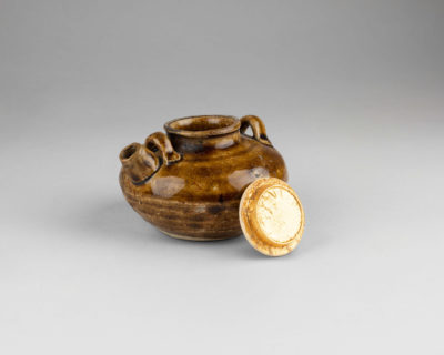 Inro par Kakosai Shozan – Rare et important Inro, ouvrant par 4 cases et un couvercle, en laque d’or urushi, représentant des rats près de grosses balles de riz. Fond or en kinji magnifiquement poli et lustré et riches incrustations de nacre dans la représentation des rats en haut relief, les balles et les graines de takamakie et l’intérieur de nashiji. Sujet associé au dieu Daikoku. Ojime en bois doré assorti. Signé Kakosai Shozan. Hauteur : 10 cm x Longueur 6,2 cm. Exceptionnelle qualité de laque et de sculpture. Japon, Edo (1615-1868) début du XIXe siècle. Provenance : Collection Hartman, USA. Le décor peut être mis en rapprochement avec un Egoyomi, 1790–1795, Brooklyn Museum et une œuvre de Katsushika Hokusai, 1843.