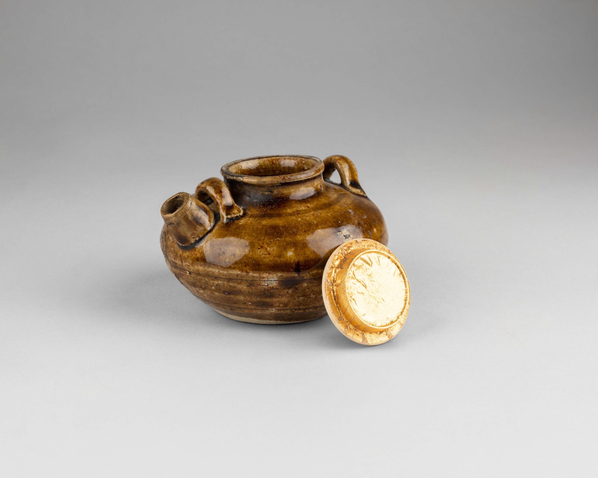 Inro – Rare petit modèle en laque d’or urushi, typique de la production dite des laques de Koetsu, école Rimpa ou école de Kôrin – Ogata Korin (1658-1716). Formes fortement bombées très caractéristiques, espace intérieur divisé en deux parties, utilisation de matériaux divers tels que : argent, or, nacre, et plomb et apparente simplicité avec concision du trait, sont autant de caractéristiques de cette production unique. Il s’agit ici d’un petit modèle à décor de fleurs et feuillages. Hauteur : 4 cm. Largeur : 4,2 cm. Japon Edo (1603-1868) 18e siècle.