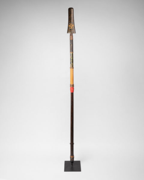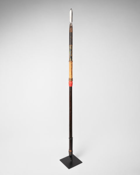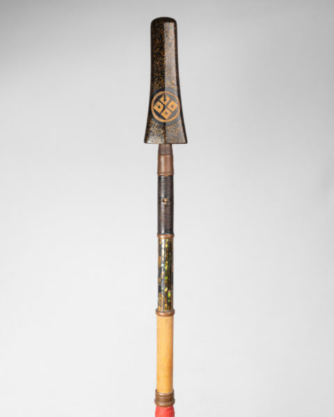 Yari couverte Période Edo Yari en forme de lance, ou plus précisément de lance à pointe droite. Galuchat, Incrustations de burgeau En partie basse, le hirumaki protège la hampe des dommages par contact avec le sol, mais qui peut également être utilisé pour la frappe et la poussée. Longueur : 108,5 cm