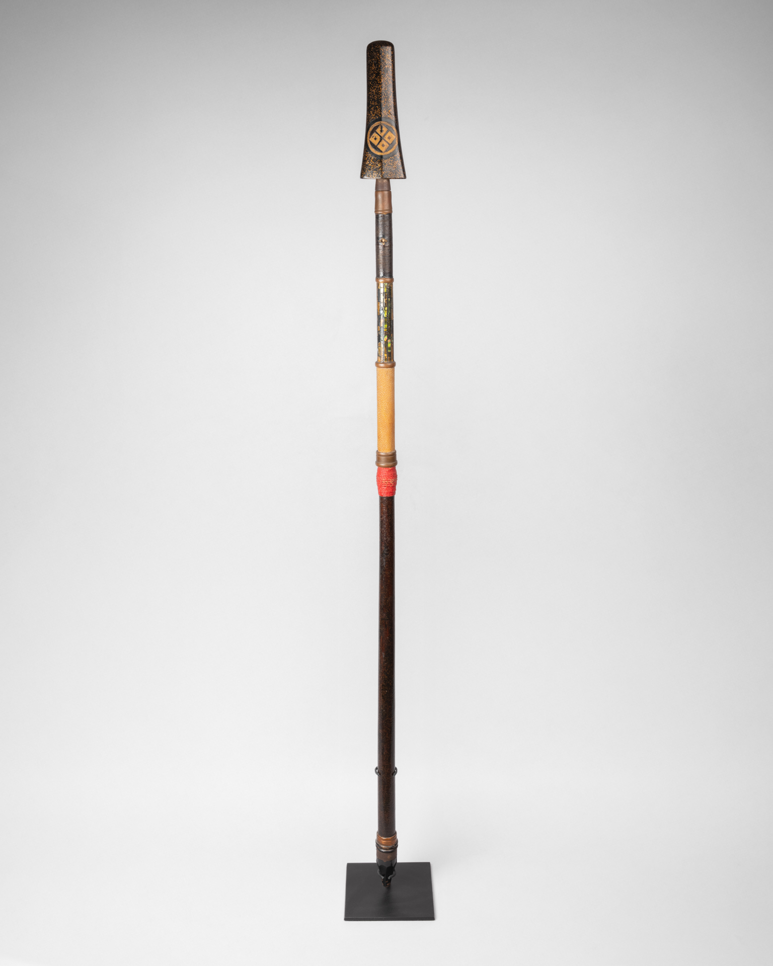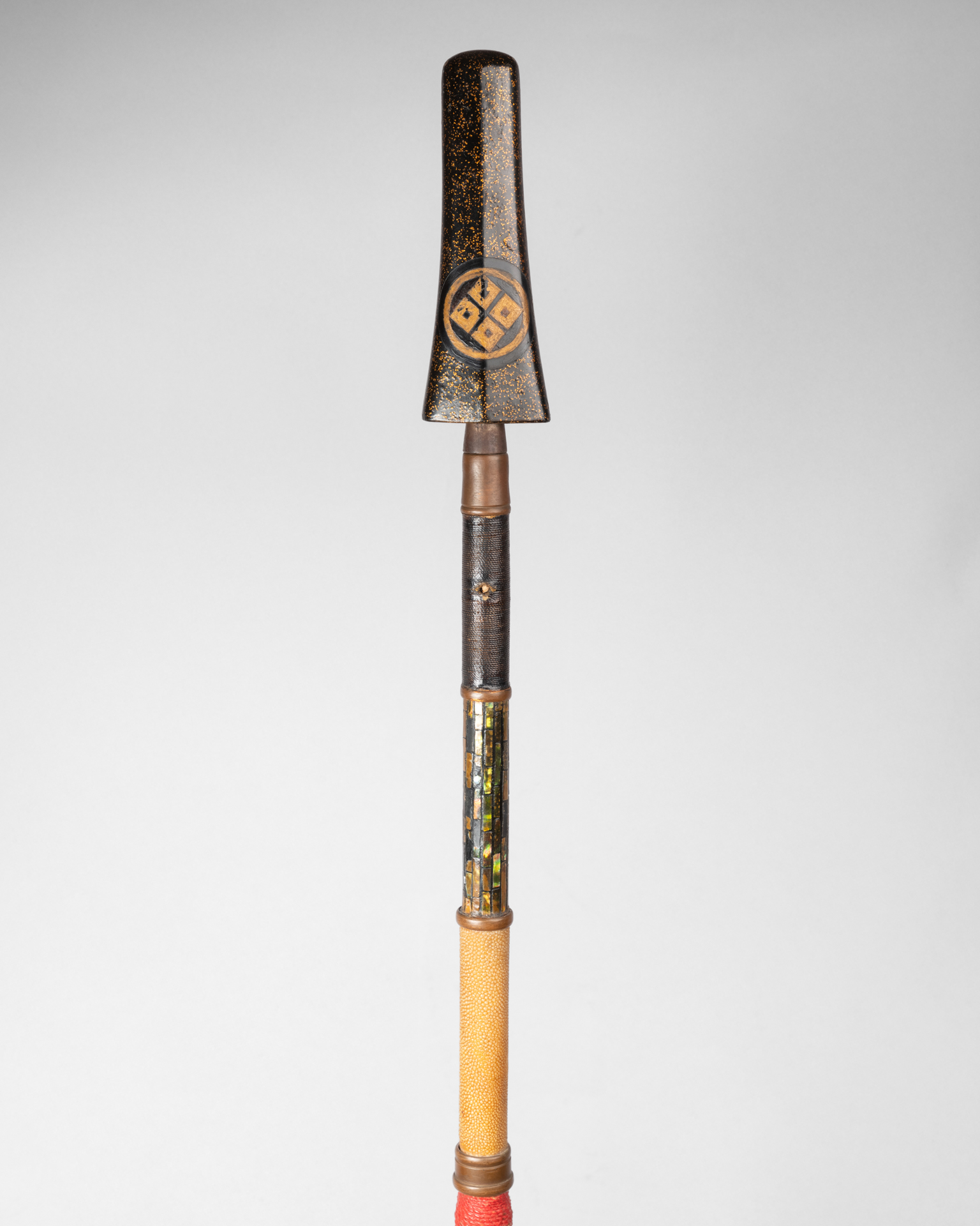 Yari couverte Période Edo Yari en forme de lance, ou plus précisément de lance à pointe droite. Galuchat, Incrustations de burgeau En partie basse, le hirumaki protège la hampe des dommages par contact avec le sol, mais qui peut également être utilisé pour la frappe et la poussée. Longueur : 108,5 cm