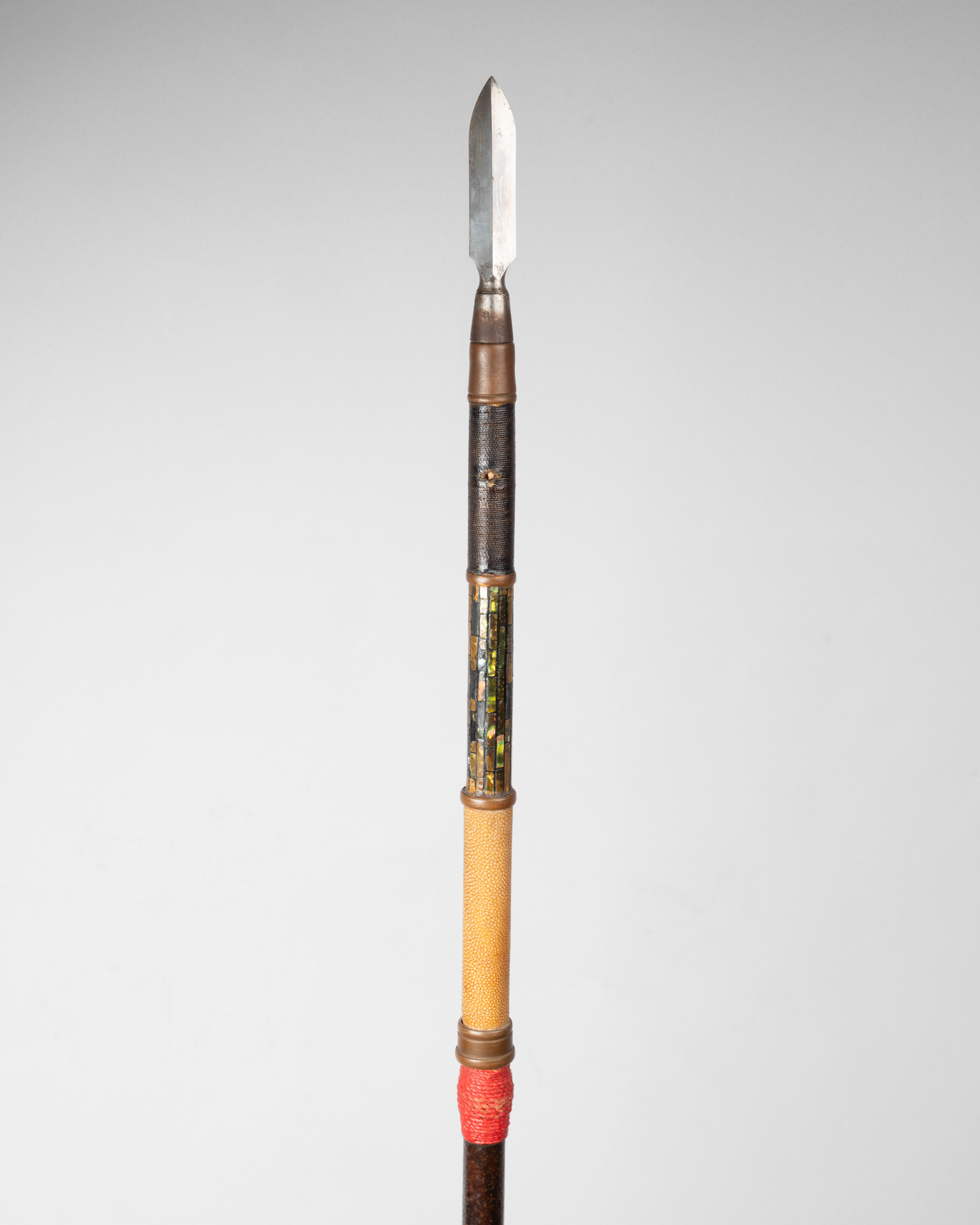 Yari Samurai Spear Edo Period Yari shaped like a spear, or more precisely a straight-pointed spear. Shagreen, Burgeau inlays. The lower part of the spear is hirumaki, which protects the shaft from damage caused by contact with the ground, but can also be used for striking and thrusting. Length : 108,5 cm