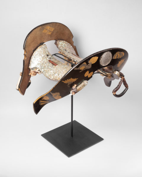 Kura en laque du Japon (Selle japonaise) Période Edo. De forme classique décorée de toutes parts, de laque noir, d’argent et or, de coquillages sur fond noir. Intérieur richement orné en burgau. Avec ses accroches pour étriers. 36 cm de long.