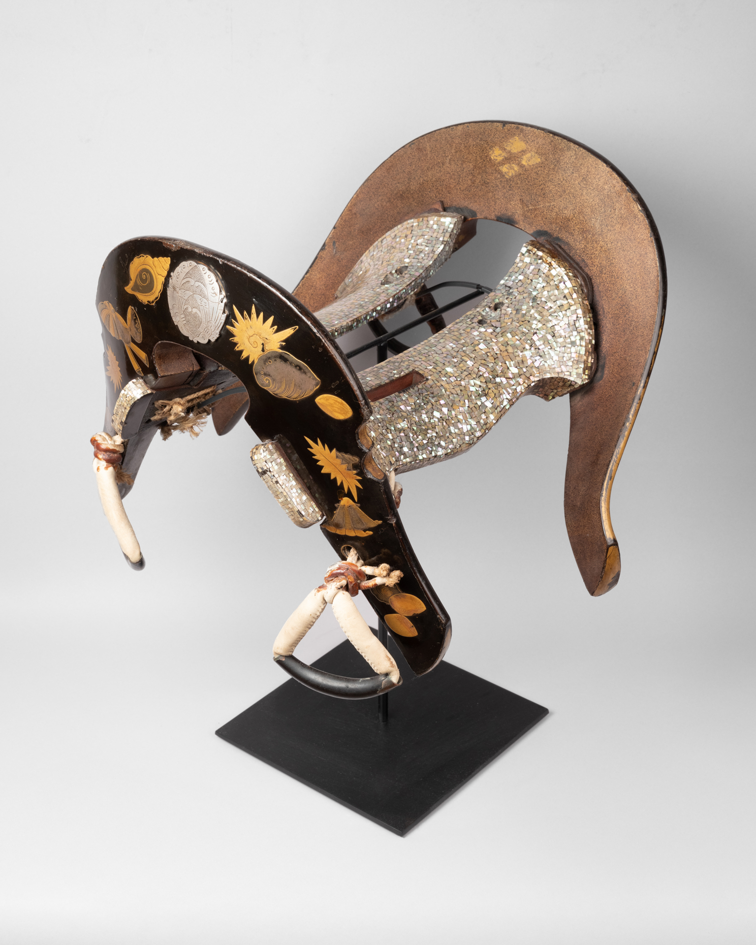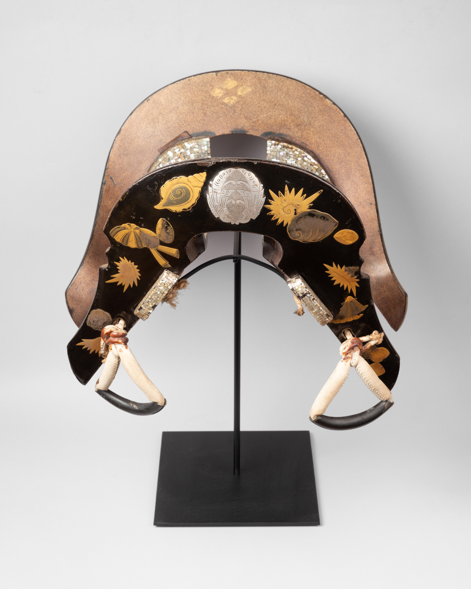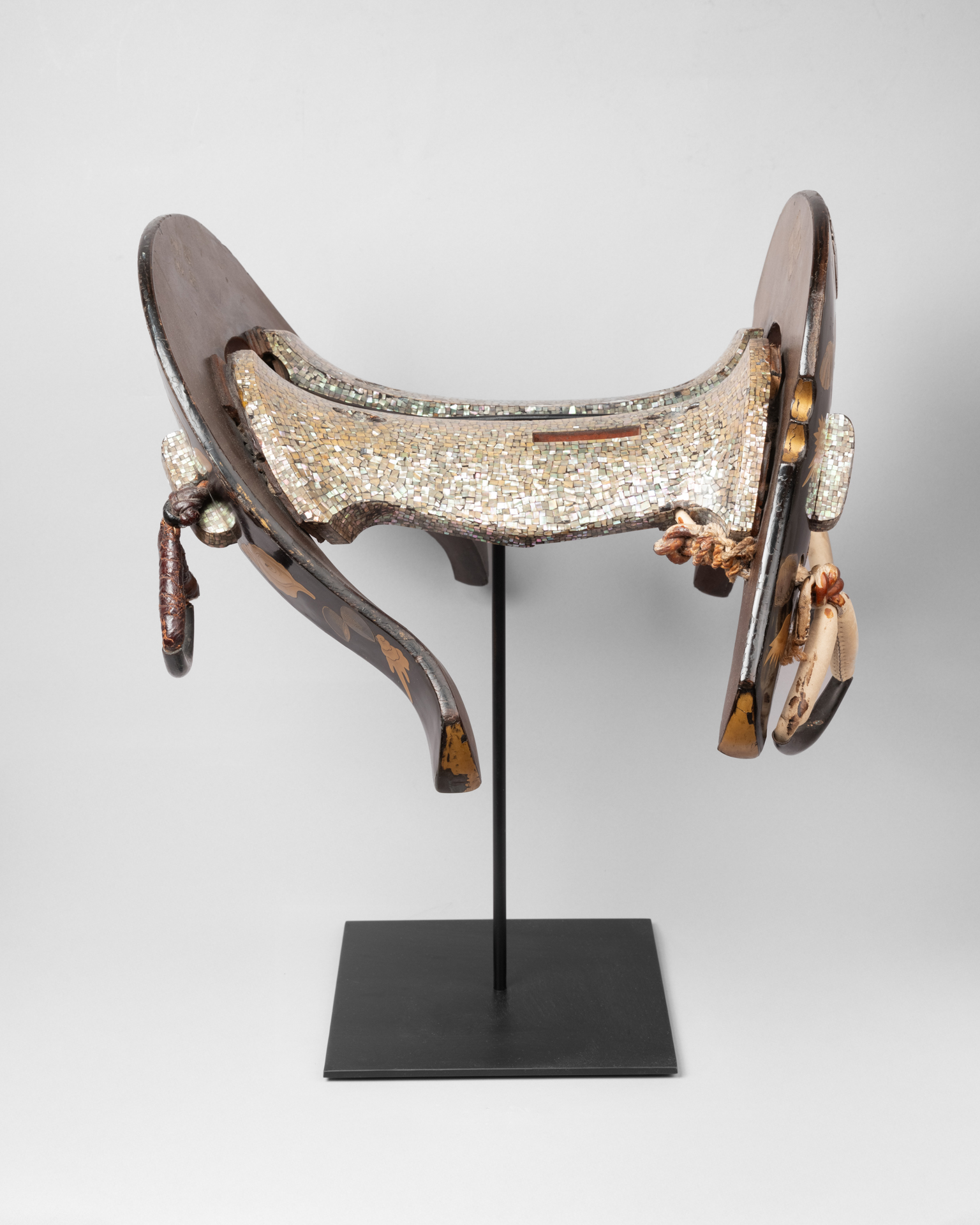 Kura en laque du Japon (Selle japonaise) Période Edo. De forme classique décorée de toutes parts, de laque noir, d’argent et or, de coquillages sur fond noir. Intérieur richement orné en burgau. Avec ses accroches pour étriers. 36 cm de long.