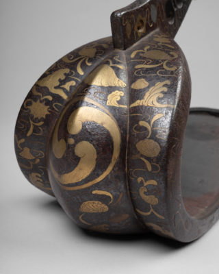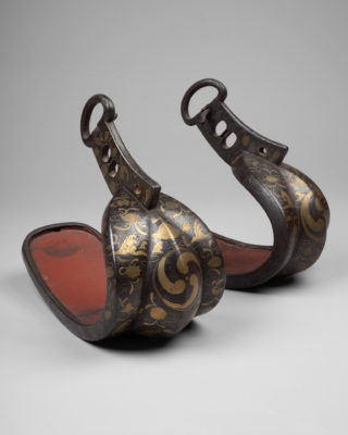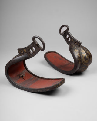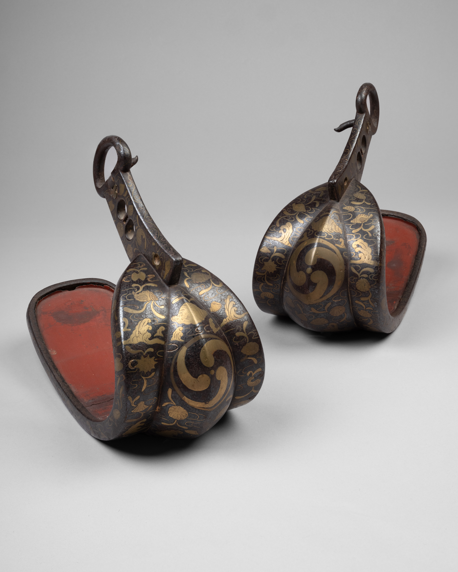 Abumi Edo period, early 17th century A pair of stirrups, typical form, inlaid in bronze with Tomoe-mon, shells, seaweed and flowing water. Red lacquer inside. 27,5 cm