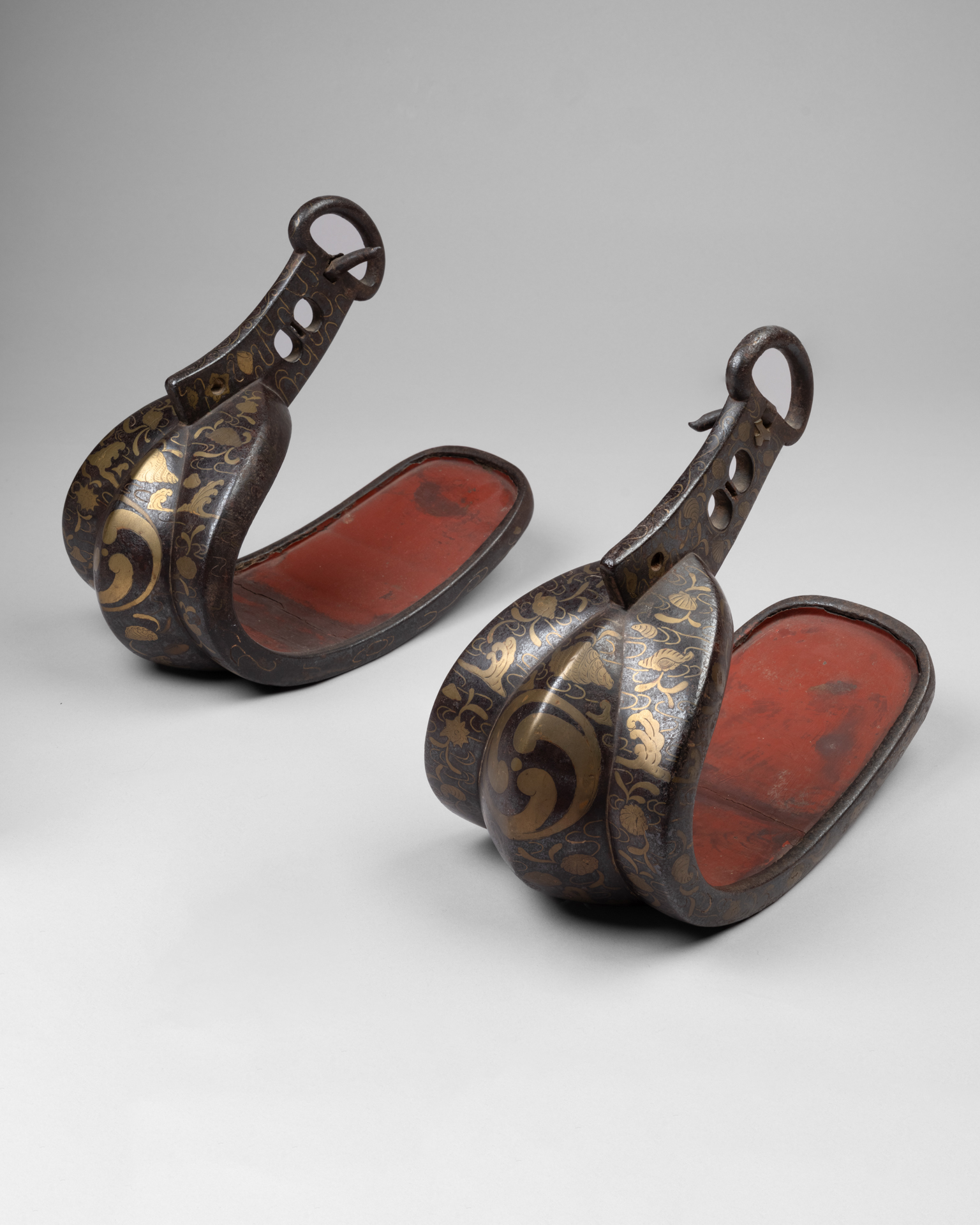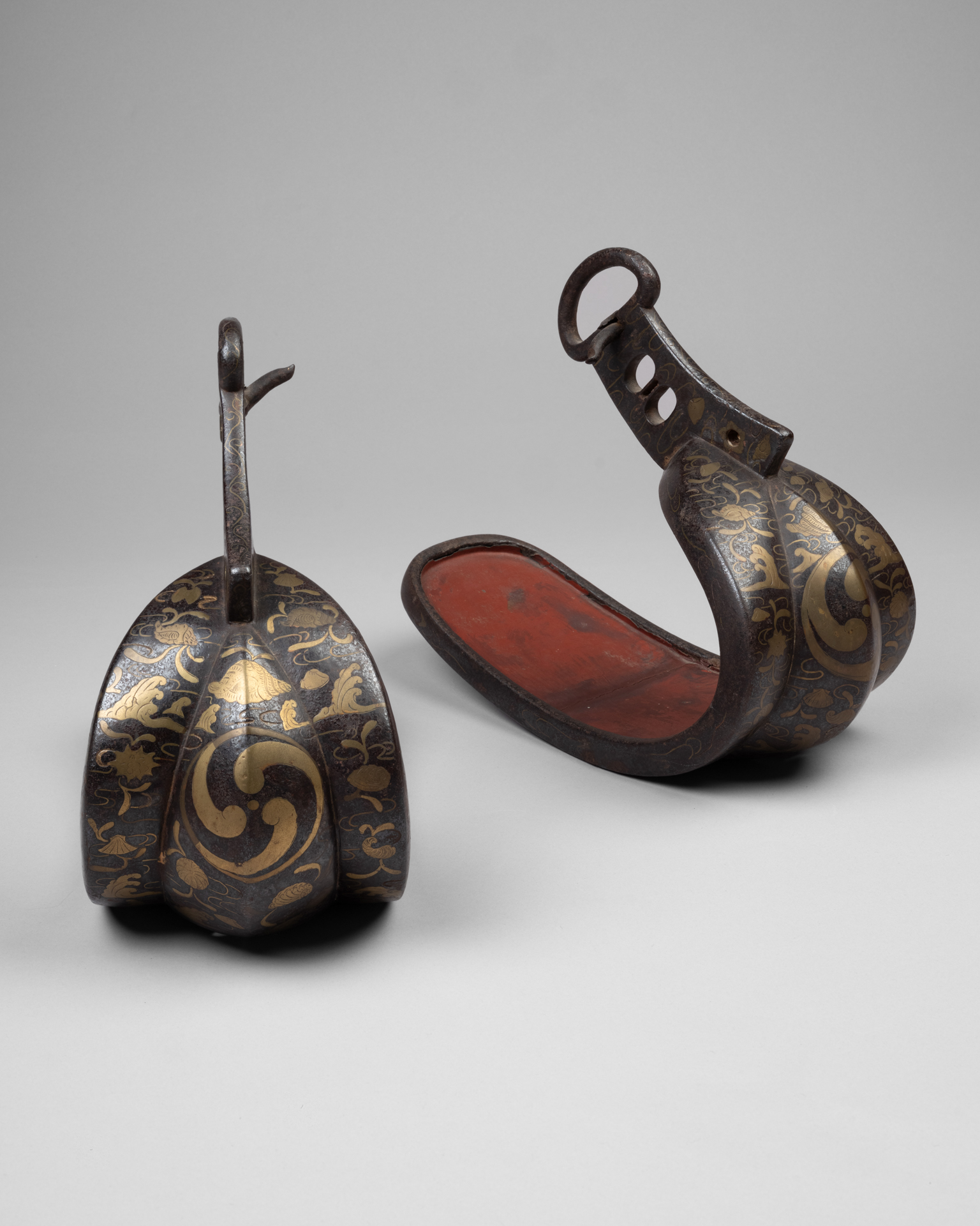 Abumi Edo period, early 17th century A pair of stirrups, typical form, inlaid in bronze with Tomoe-mon, shells, seaweed and flowing water. Red lacquer inside. 27,5 cm