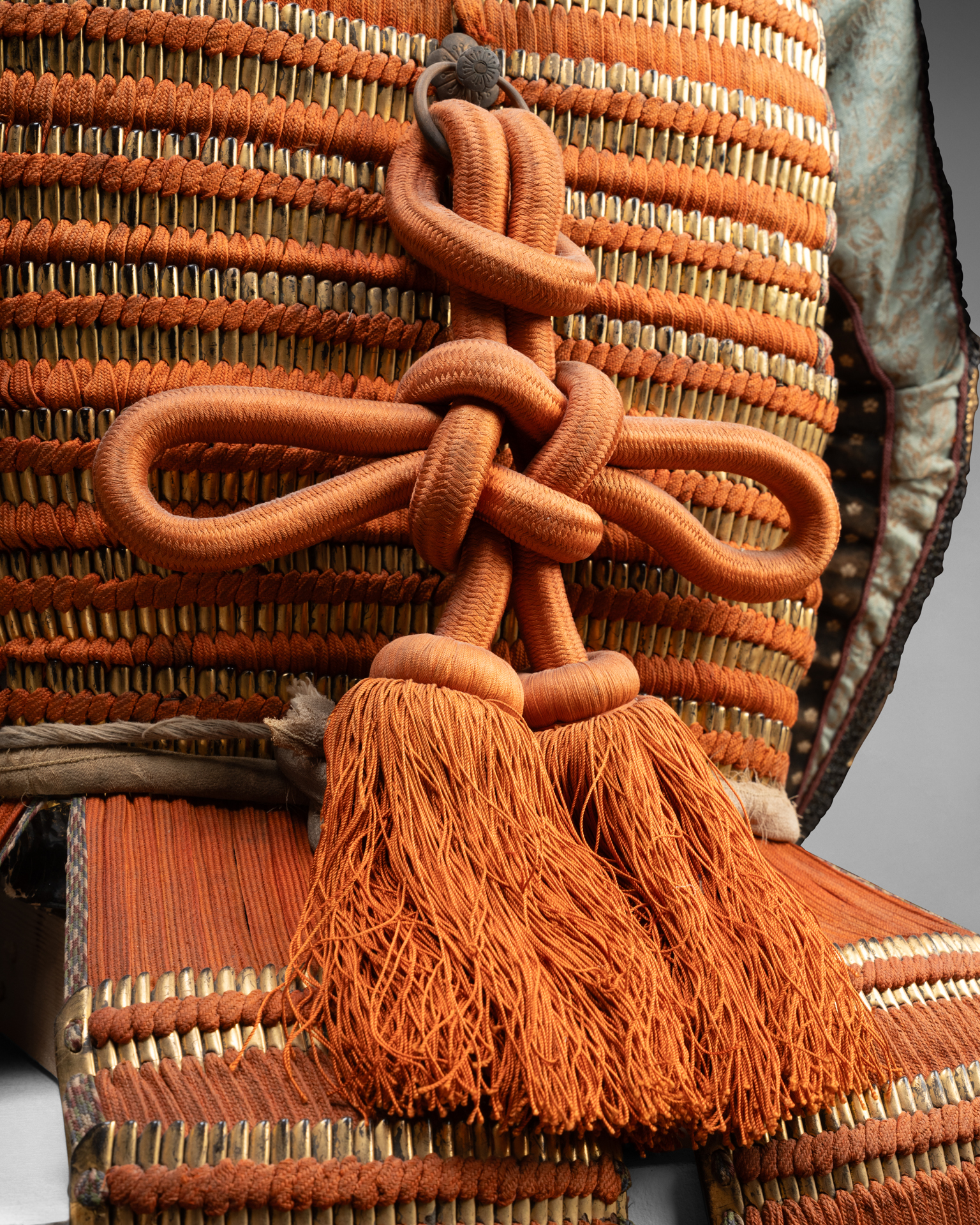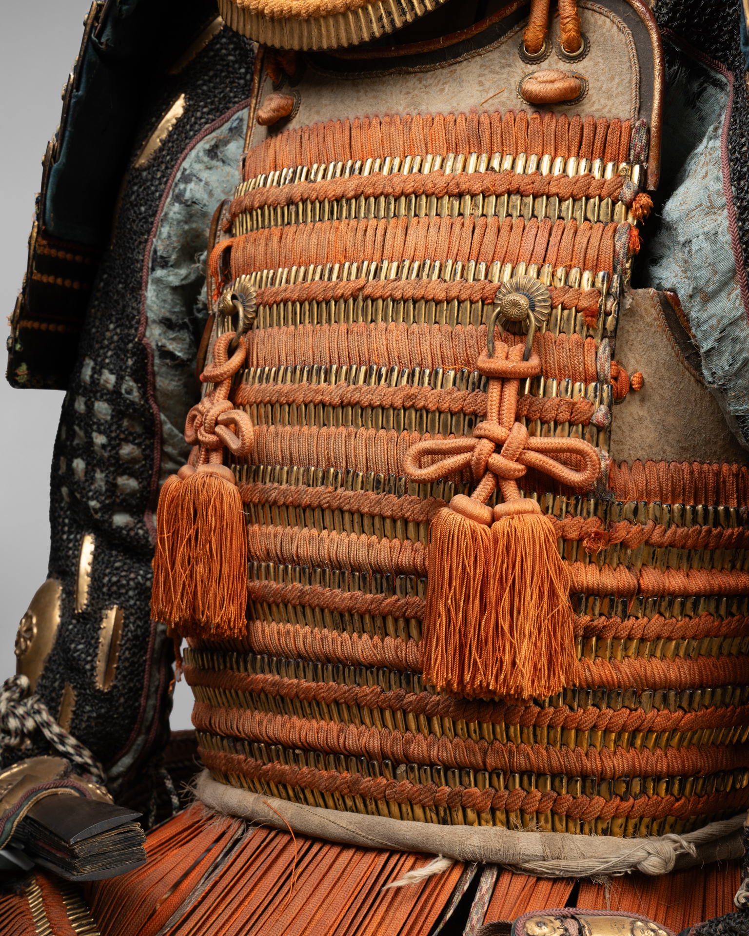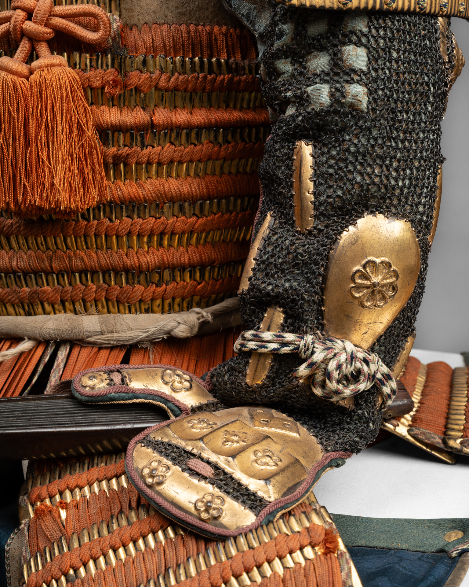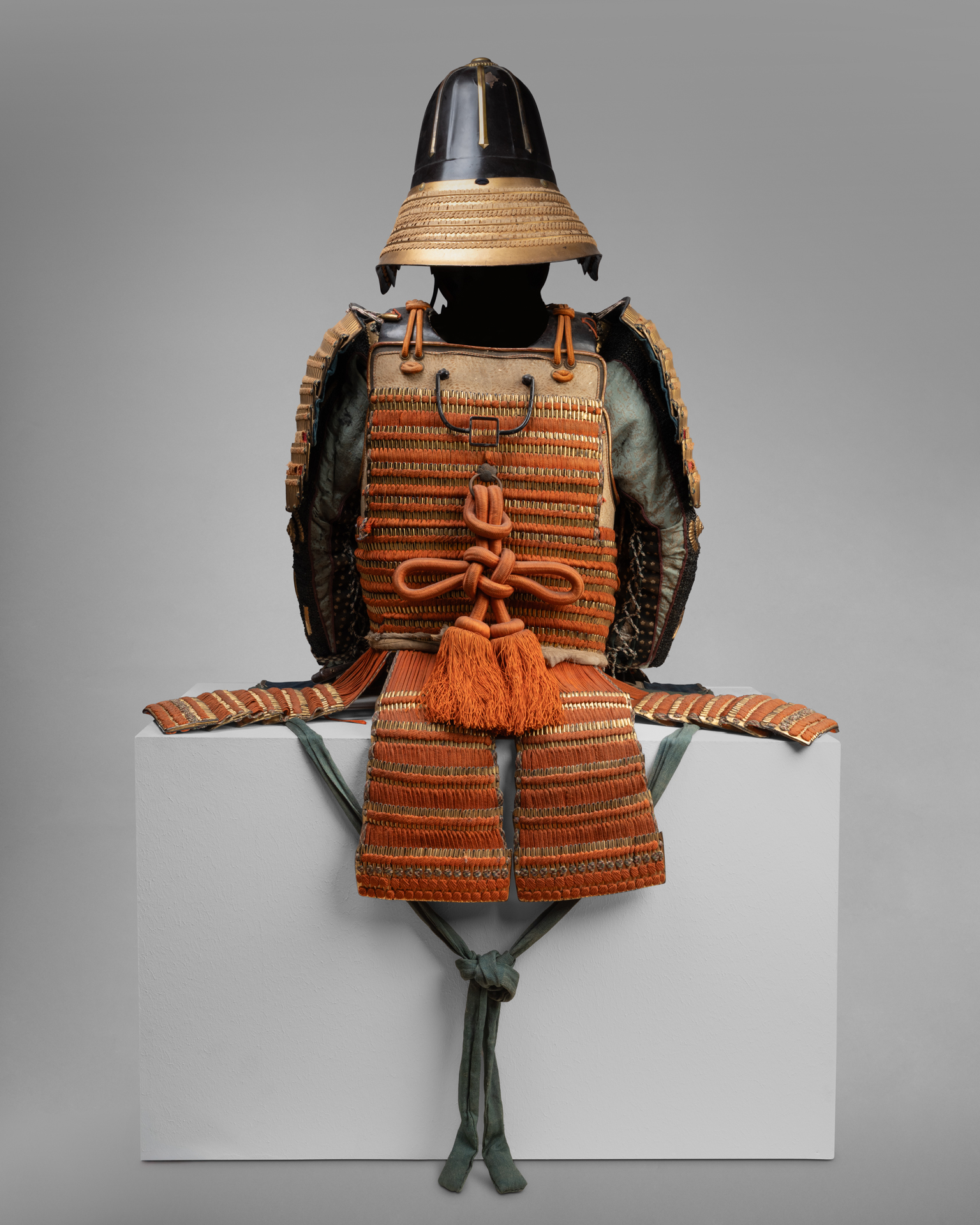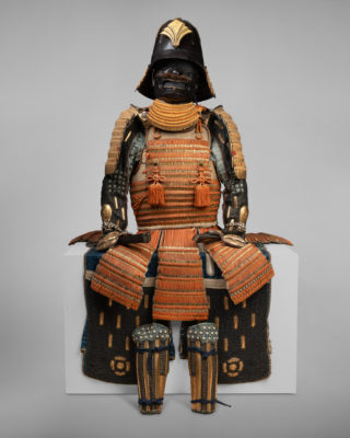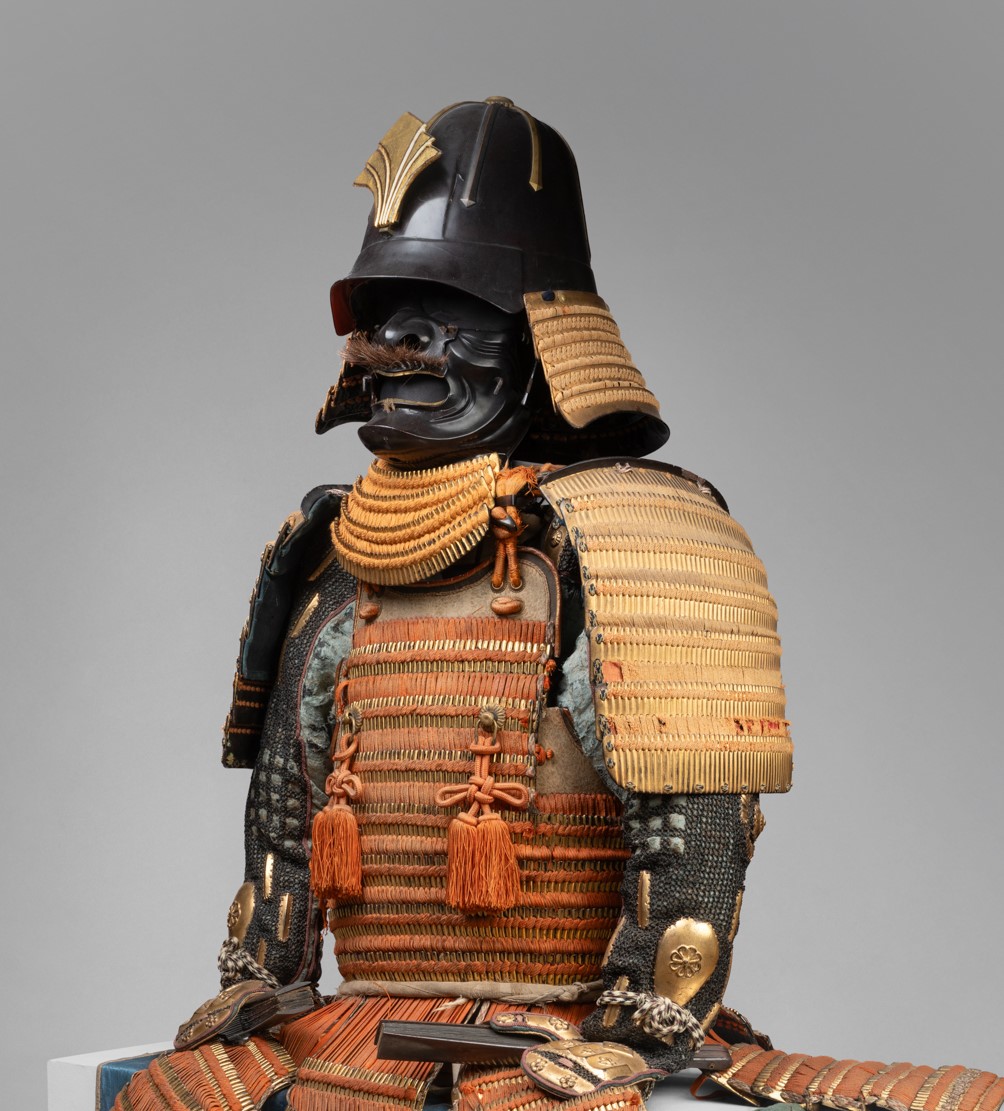 Yokohagi-dô Armor Iron and gold lacquer, orange and midnight blue cords Edo period, early 18th century Kabuto: Iron bowl with eleven plates, in the shape of a shii-nari, finished with a copper tehen kanamono ring, mabisashi with a hammered front, small black lacquered fukigaeshi, three-tiered gold lacquered shikoro with kebiki odoshi in yellow/orange braid and Maedate. Ryubu-style iron mempo features a half-open mouth. The lacquered sabiji-nuri do, articulated in two pieces and composed of horizontal plates with standing rivets, fukurin (ornamental border) in gilded copper and shakudo chiseled and engraved in relief with foliage scrolls, six five-tiered kusazuri. Sode, six-tiered kote decorated with yellow/orange lacing on a gold ground. Chainmail kote. Haidate, sune-ate