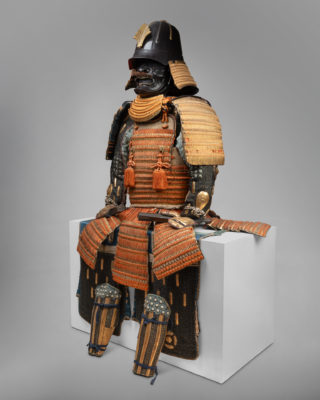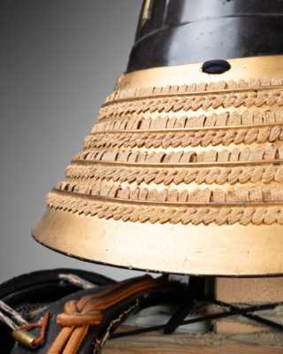 Armure Yokohagi-dô Période Edo, début du 18e siècle En suite. Fer et laque d’or, cordons couleurs orange et bleu nuit Kabuto : Bol en fer à onze plaques, en forme de shii-nari [gland], terminé par un anneau de cuivre tehen kanamono, mabisashi [pic] à front martelé, petits fukigaeshi [retrousses] laqués noirs, shikoro [protège-nuque] laqué or à trois niveaux avec kebiki odoshi [lacage serré] en galon jaune/orangé et Maedate. Mempo en fer de style ryubu présente une bouche entrouverte. Le do laqué en sabiji-nuri, articulé en deux pièces et composé de plaques horizontales avec des rivets debout, de fukurin (bordure ornementale) en cuivre doré et shakudo ciselé et gravé en relief de rinceaux de feuillage, de six kusazuri (jupe) à cinq niveaux. Sode, kote à six niveaux décoré de laçage jaune / orangé sur fond or. Kote en cotte de mailles . Haidate, sune-ate