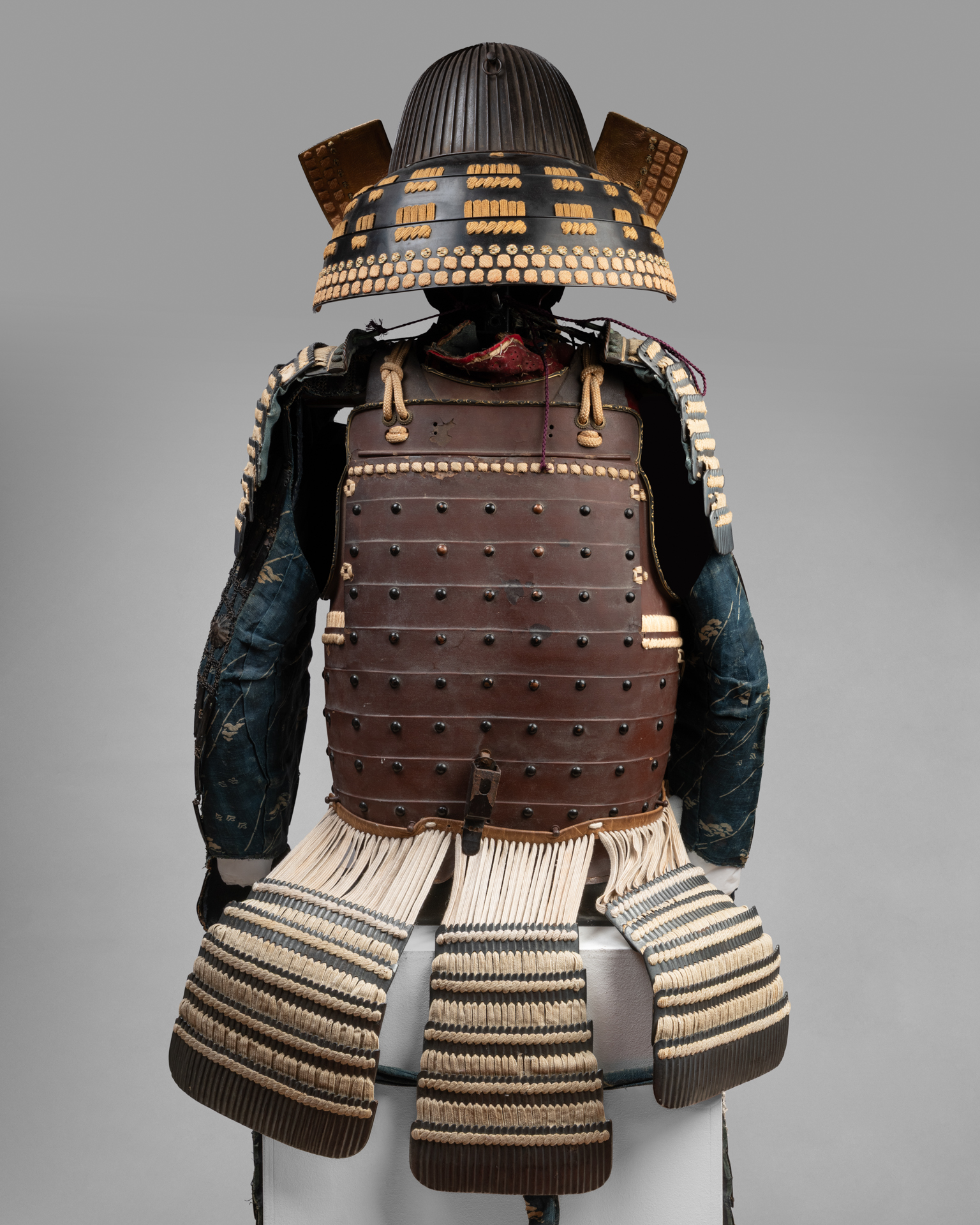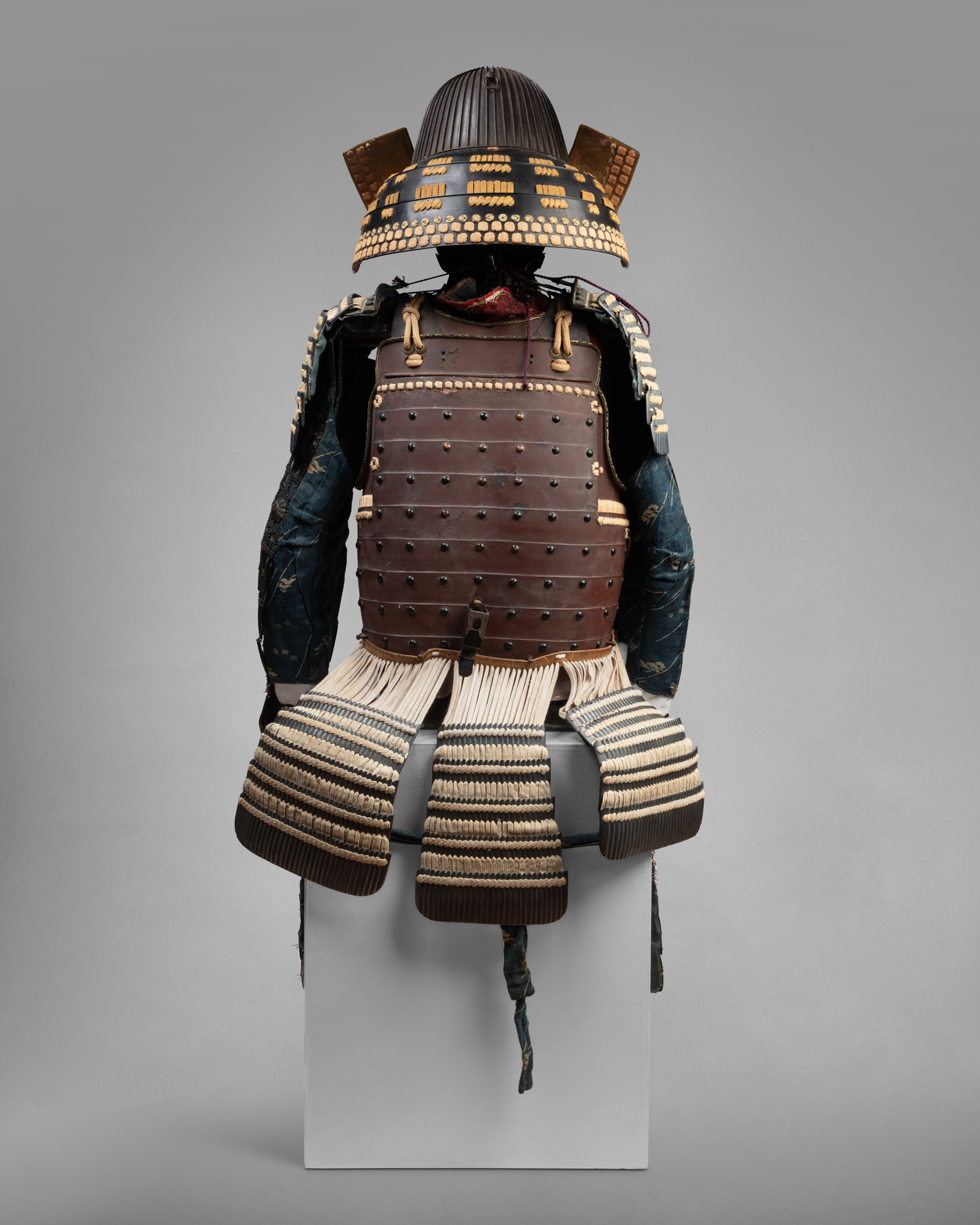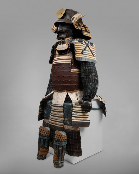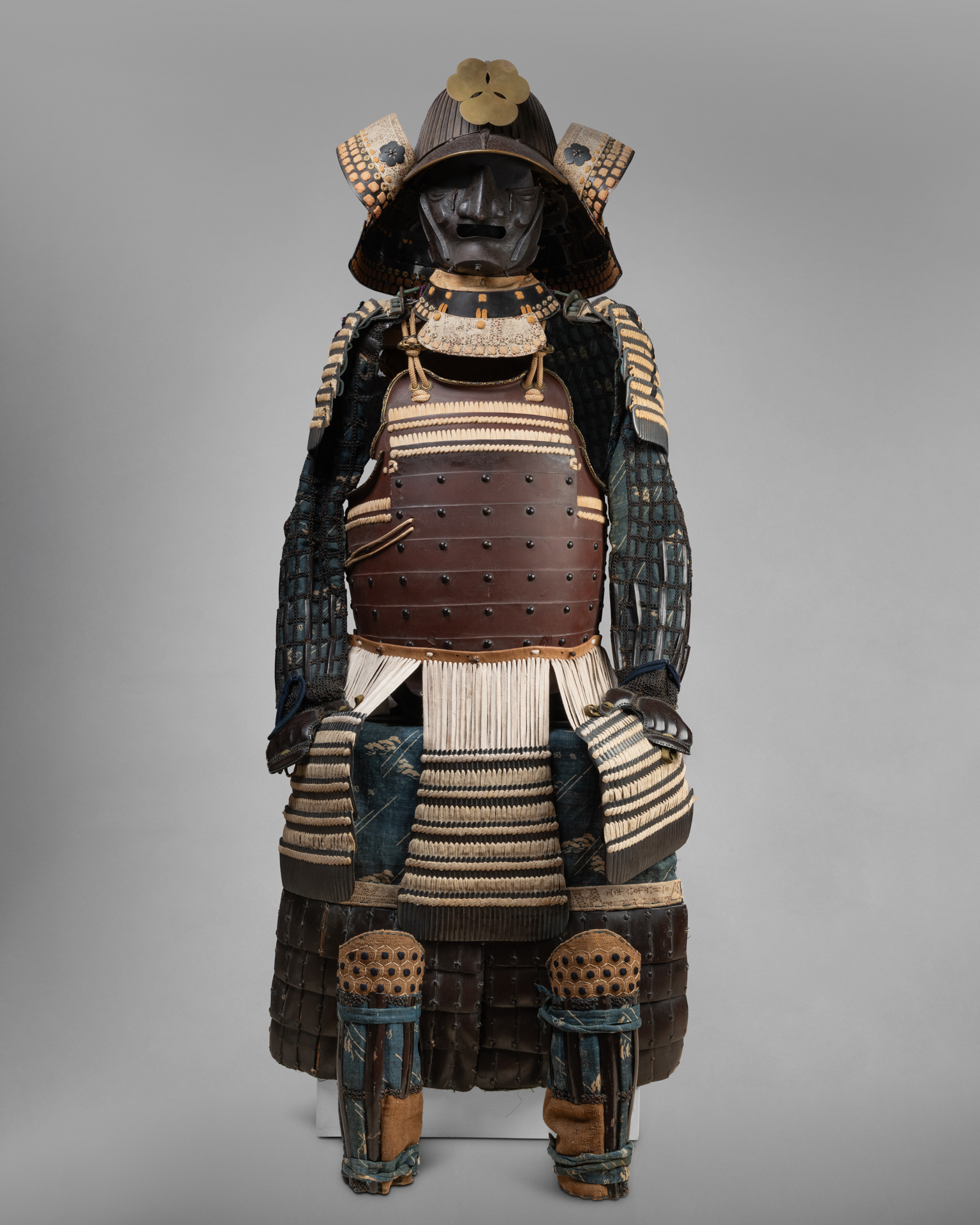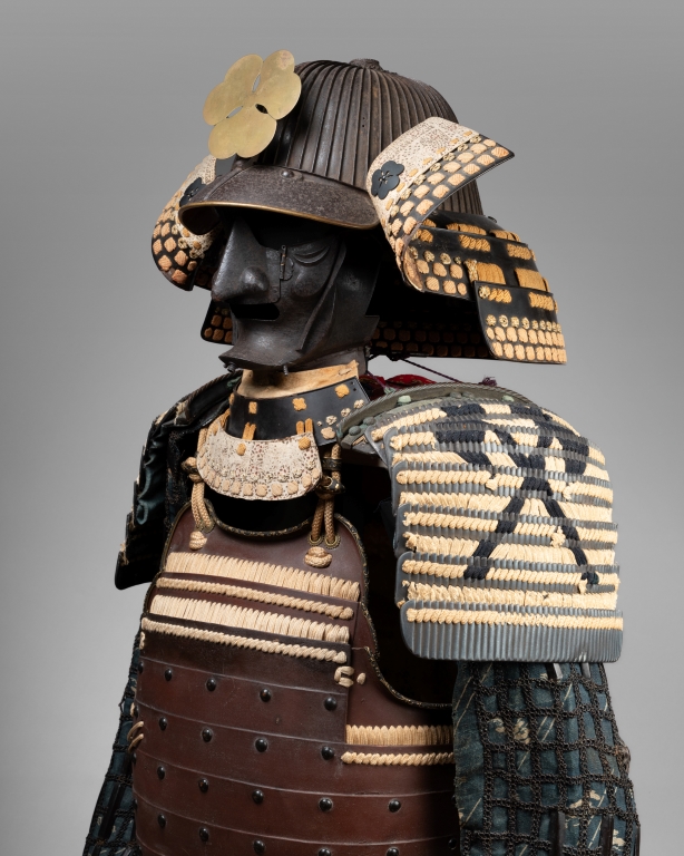 Armour – A yokohagi nimai-do gusoku The helmet signed Joshu ju Saotome Ienari (Hitachi Province) Edo period, 18th century Kabuto : The sixty-two plate russet iron bowl with raised ridges, terminating in a five-stage russet iron tehen kanamono floret, russet iron mabisashi [peak] with copper fukurin [ornamental border], the large fukigaeshi [turnbacks] of stenciled leather and applied with patinated metal katabami mon [wood sorrel crests], two-tiered black lacquer itamono manju-jikoro [rounded neck guard with solid plates] wiith sugake odoshi [spaced lacing] in pale orange braid, gilt metal maedate [forecrest] in the form of a further katabami mon Mempo : The russet iron mempo [face mask] in ryubu style with gentler expression and mouth slightly ajar, hinged nose plate, yadome [standing flanges] to the cheeks, black lacquer interior, two-tiered stenciled leather and black lacquer yodaregake [throat protector] laced in matching braid Do : The sabiji-nuri [simulated russet iron] lacquered do [cuirass] hinged in two pieces and comprised of horizontal plates with standing rivets, copper-gilt and shakudo fukurin [ornamental border] chased and engraved in relief with foliage scrolls, six tassets of five-tiered kusazuri [skirt] Sode, kote : Six-tiered sode decorated in blue and white lacing with crossed axes, chainmail kote with blue linen lining Haidate, sune-ate : Kawara haidate with black lacquer and blue linen lining, shino suneate.