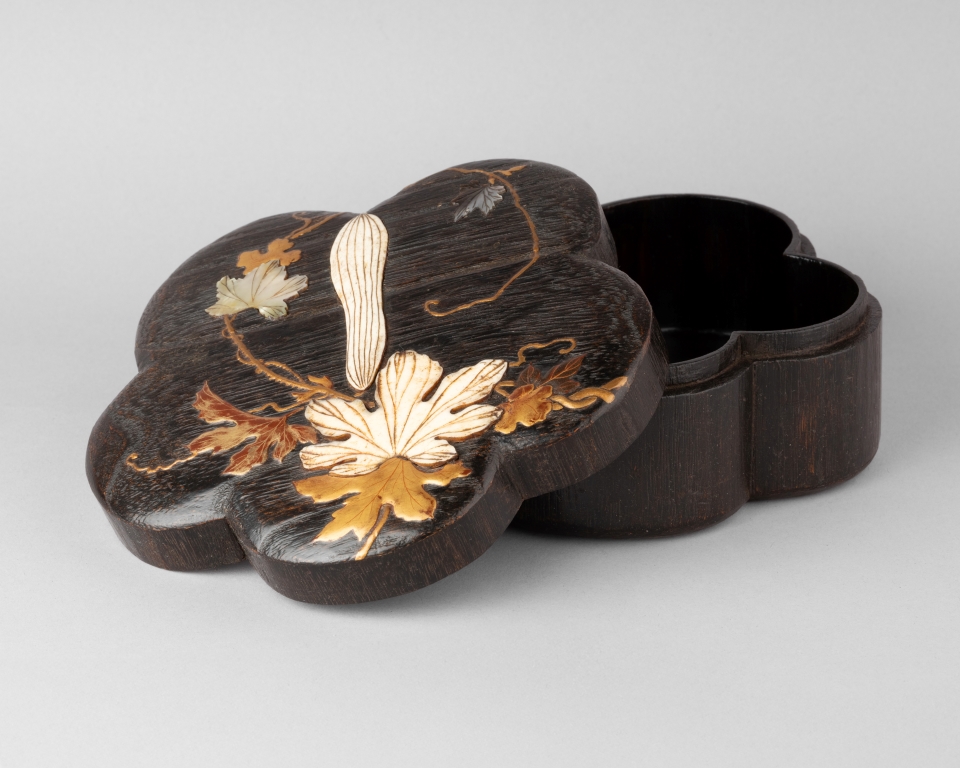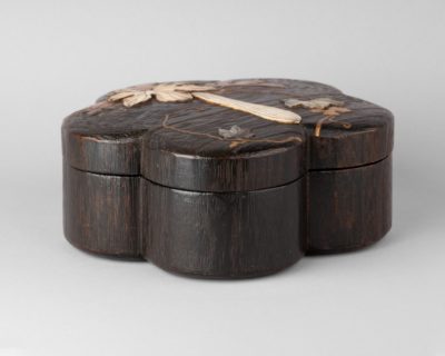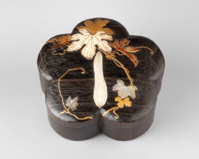 Kobako – Covered Box Late Edo, Meiji period, 19th century Made of wood, in the bulky shape of cherry blossoms, decorated with pea pods, leaves and vines.