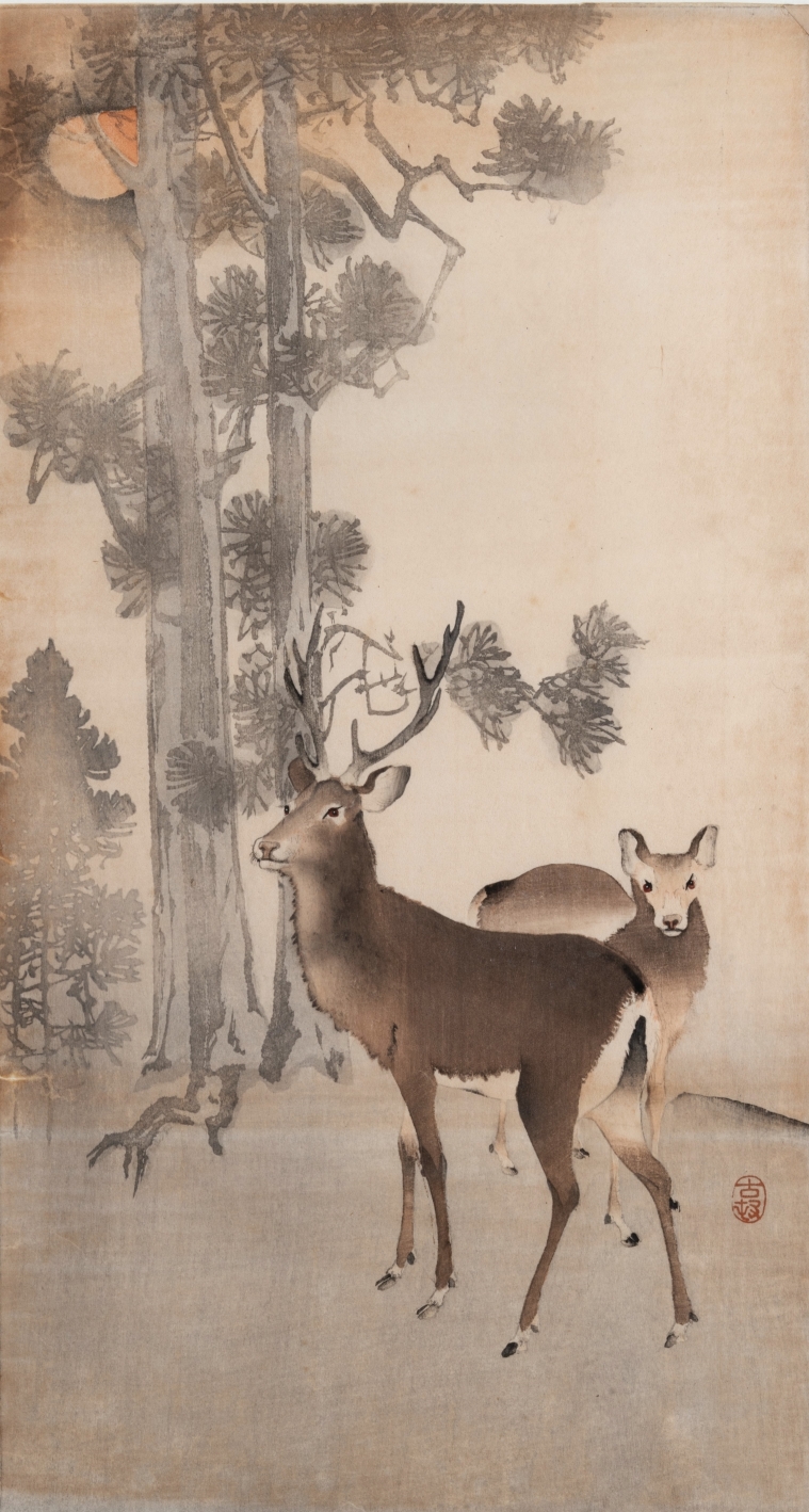 Koson Ohara (1877-1845) Couple de daims dans un paysage. Editeur : Daikokuya. Vers 1900, 1910. Taille 18,3 x 33,7 cm. Dans un encadrement sur mesure. Koson Ohara était l’un des grands graveurs du XXe siècle au Japon, reconnu pour ses gravures kacho-e d’oiseaux et de fleurs. Originaire de Matao, il est né à Kanazawa, dans la préfecture d’Ishikawa.