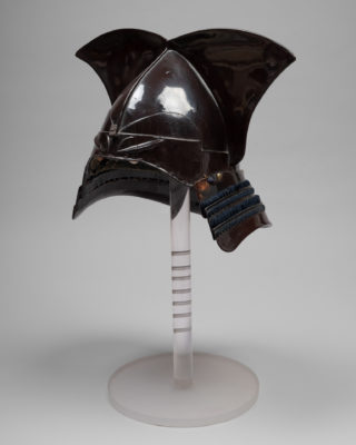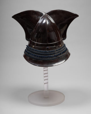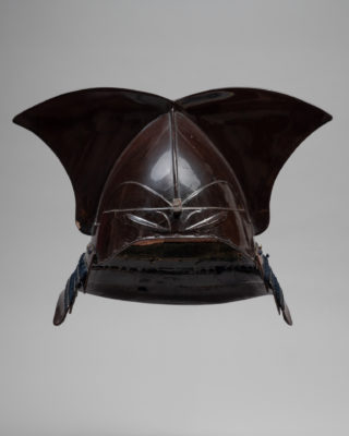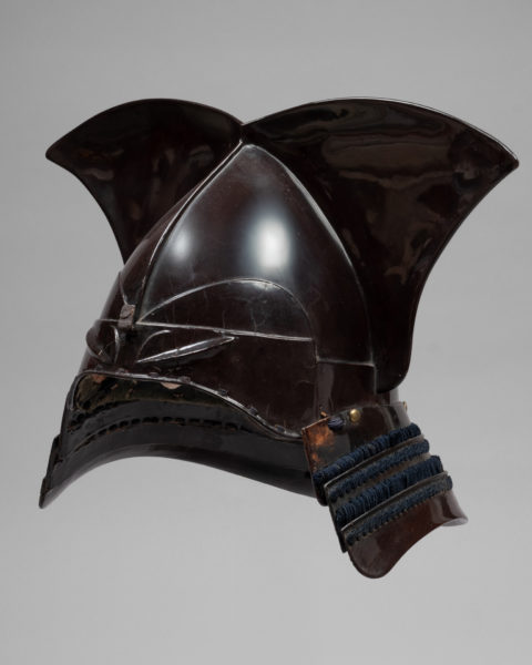 Kawari, Kabuto. Période Edo. Casque spectaculaire représentant une forme abstraite, peut-être celle d’un papillon ou d’une chauve-souris. Sculpture en laque sèche (Harikake) montée sur un timbre en fer. Non signé. En forme zunari [en forme de tête], modelé jusqu’à la couronne avec des plaques de fer supplémentaires modelées comme un sosho-zukin stylisé [capuchon de prêtre],l’itamono hineno jikoro [protège-nuque ajusté avec plaques solides] en laque à quatre niveaux avec kebiki odoshi [lacage rapproché] en tresse bleu foncé.