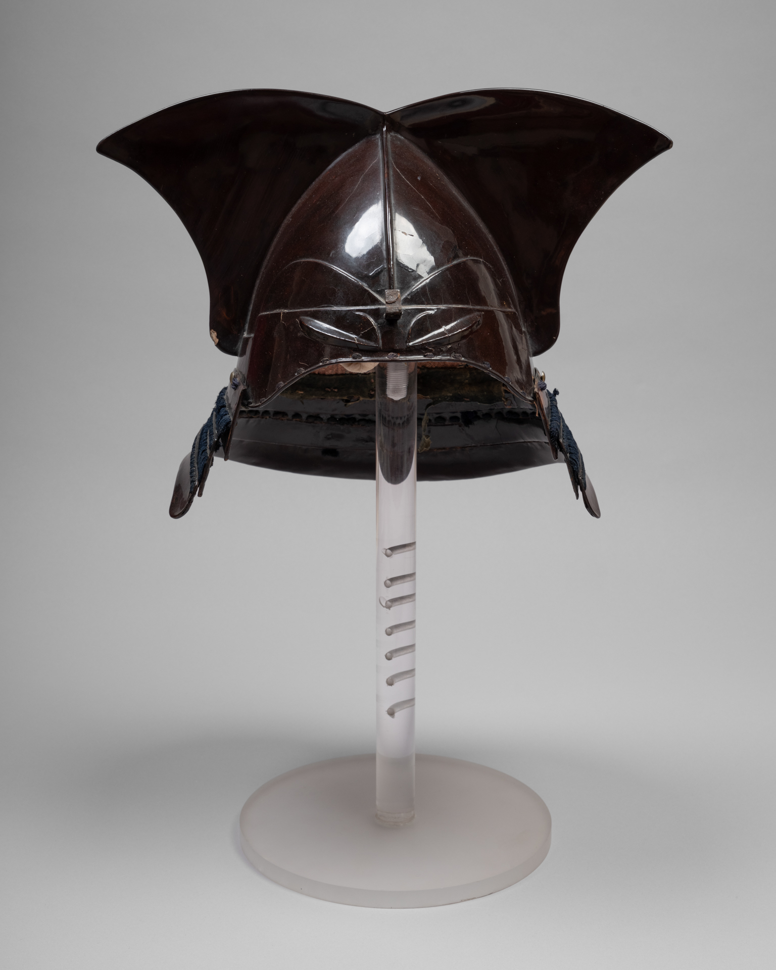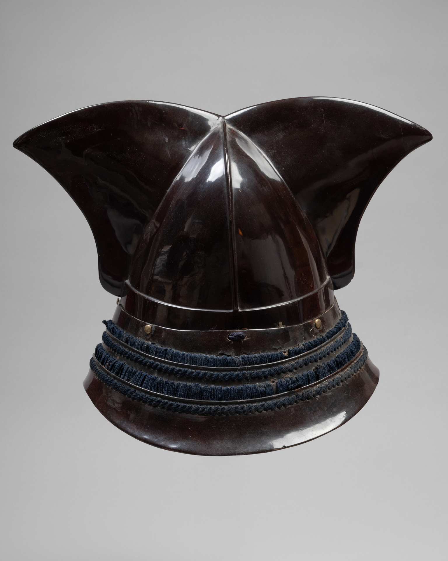 Kawari, Kabuto. Période Edo. Casque spectaculaire représentant une forme abstraite, peut-être celle d’un papillon ou d’une chauve-souris. Sculpture en laque sèche (Harikake) montée sur un timbre en fer. Non signé. En forme zunari [en forme de tête], modelé jusqu’à la couronne avec des plaques de fer supplémentaires modelées comme un sosho-zukin stylisé [capuchon de prêtre],l’itamono hineno jikoro [protège-nuque ajusté avec plaques solides] en laque à quatre niveaux avec kebiki odoshi [lacage rapproché] en tresse bleu foncé.