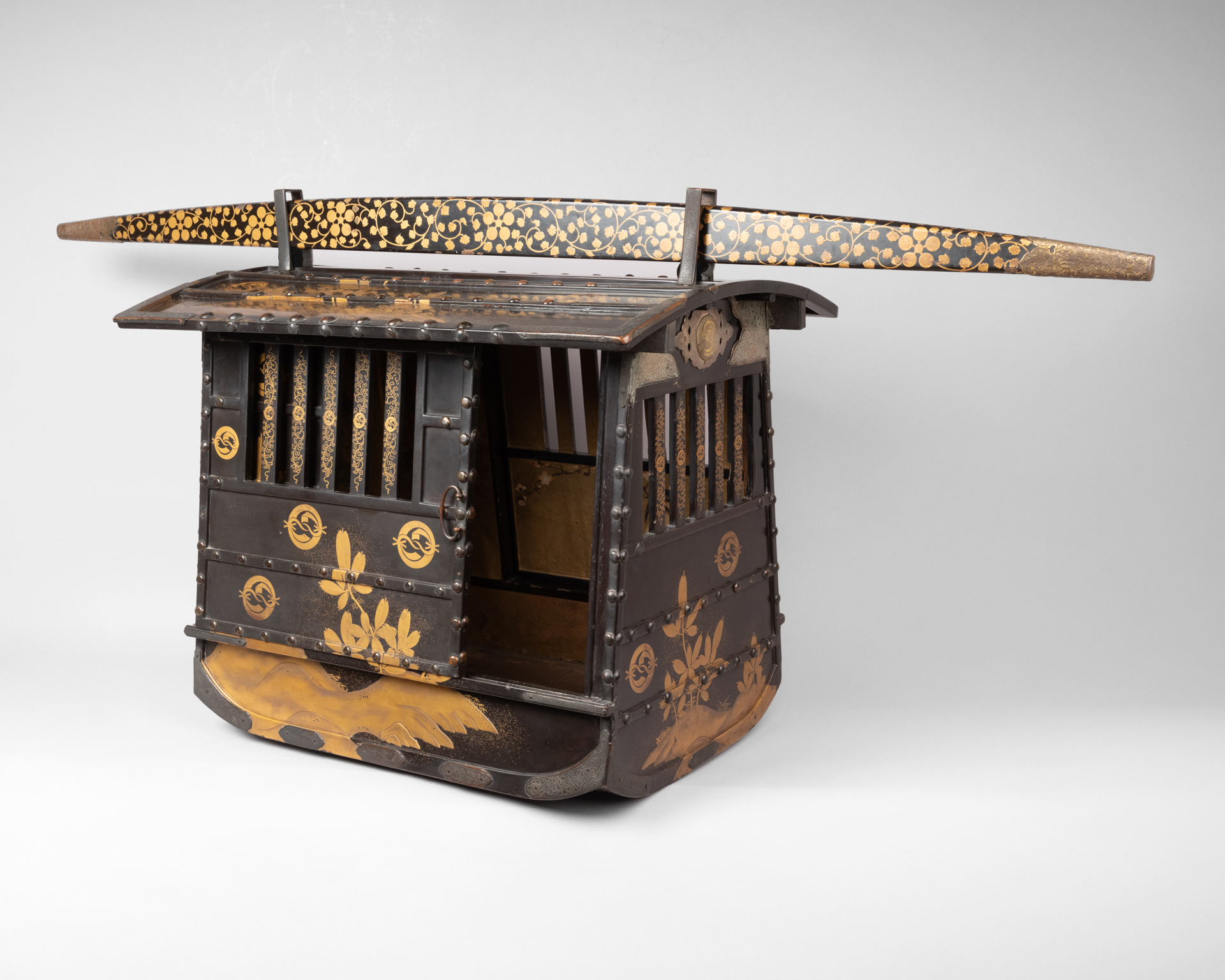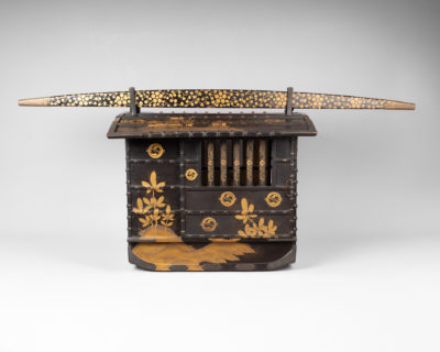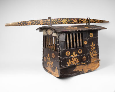 A large black and gold lacquer palanquin Japan, Edo period, 18th century The exterior decorated with pine trees, môn of Kan’in No Miya and foliage, the fittings in chiselled copper formerly gilded, opening doors, the interior painted on paper with flowers, cranes, birds, pines and trees. 47 x 39 cm without the carrying bar.