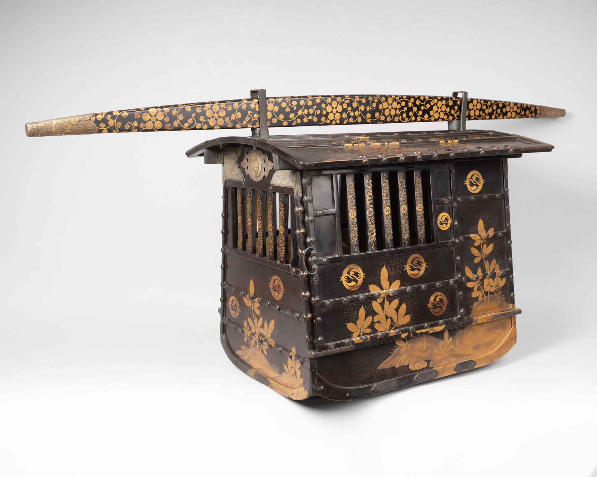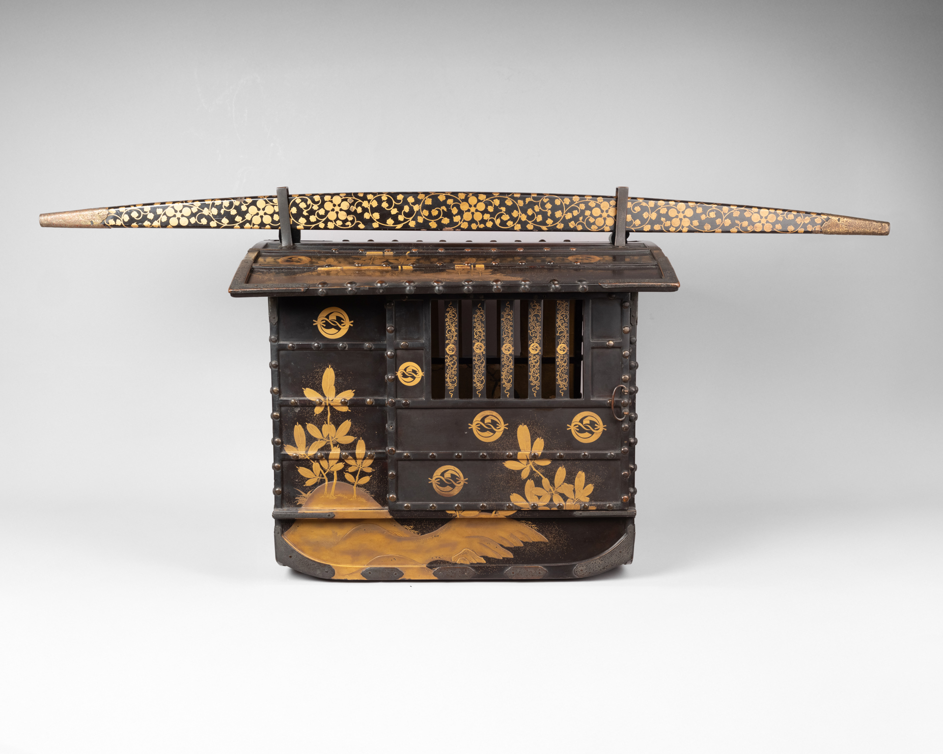 A large black and gold lacquer palanquin Japan, Edo period, 18th century The exterior decorated with pine trees, môn of Kan’in No Miya and foliage, the fittings in chiselled copper formerly gilded, opening doors, the interior painted on paper with flowers, cranes, birds, pines and trees. 47 x 39 cm without the carrying bar.