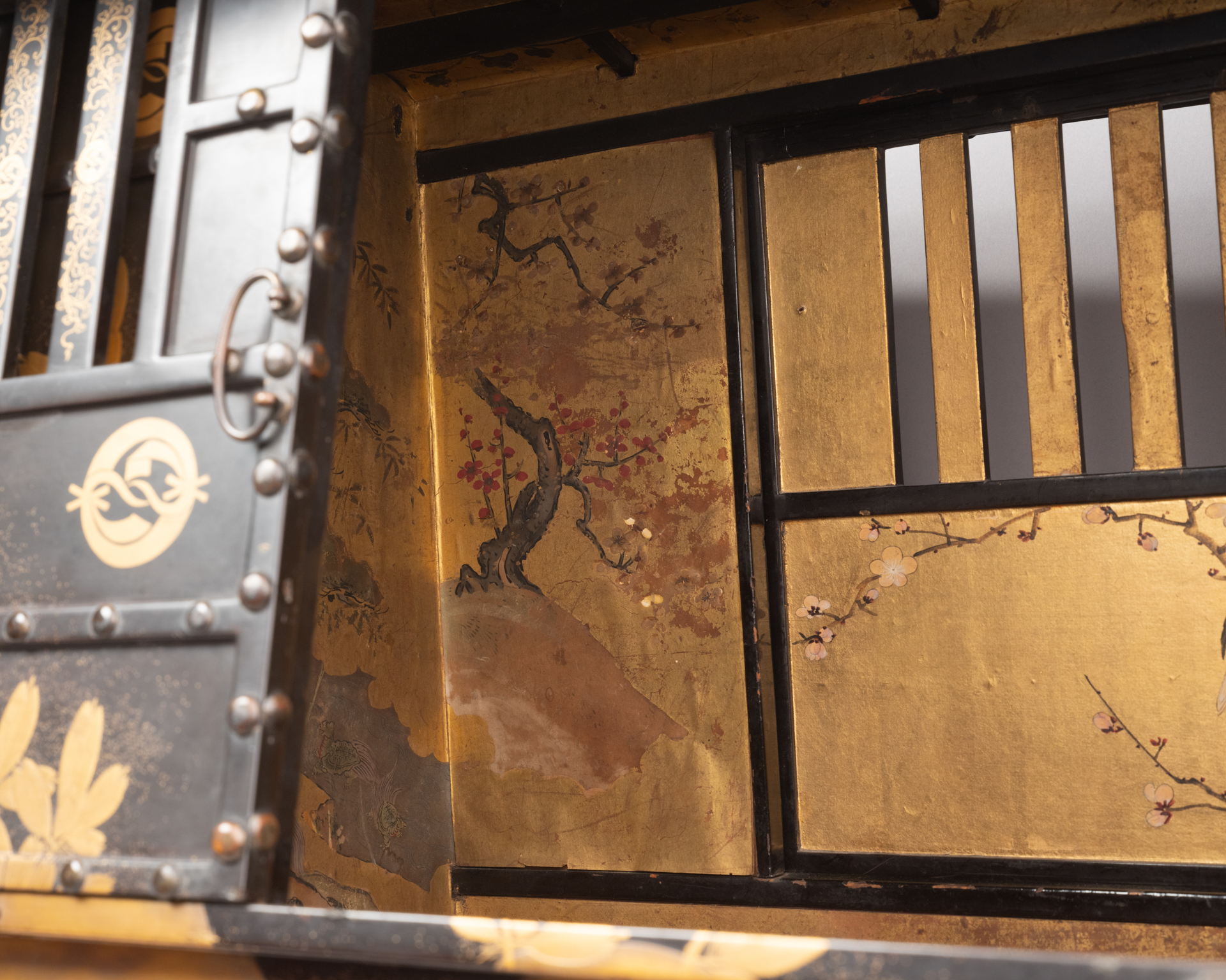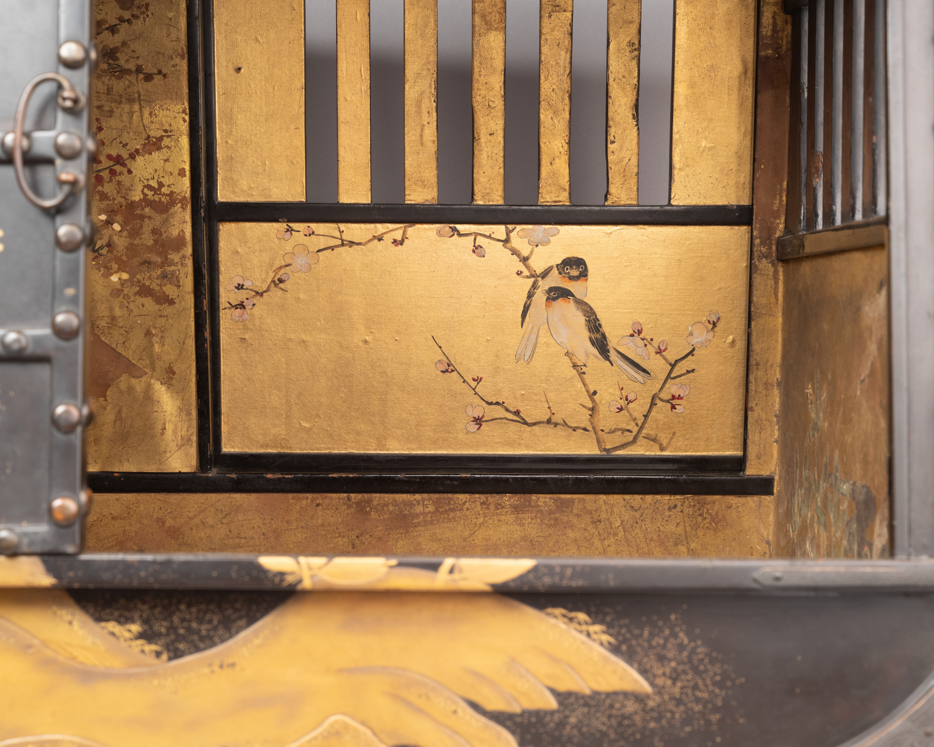 Large palanquin en laque noir et or Période Edo, XVIIIe siècle Richement orné à l’extérieur de pins, de môns du clan Kan’in No Miya (version stylisée utilisée pour les objets cérémoniels comme les palanquins) et de rinceaux. Les portes s’ouvrent sur un rare décor peint sur papier à fond or, de fleurs, grues, pins, prunier et Tortues Minogame et oiseaux. Dimensions : 47 x 39 cm sans la barre de portage.