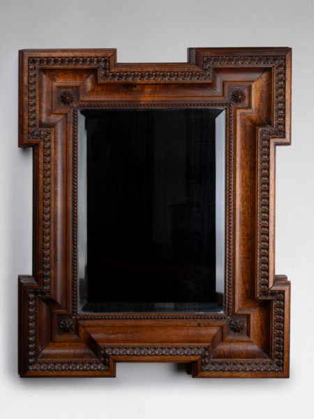 Miroir en noyer, mouluré, sculpté, à décor d’une frise de rais de cœurs Assemblage par tenons et mortaises Dimensions : 56 x 47 cm. Travail européen, 19e siècle.