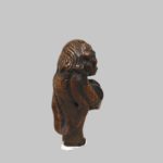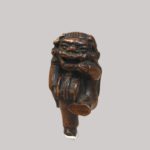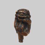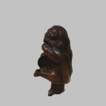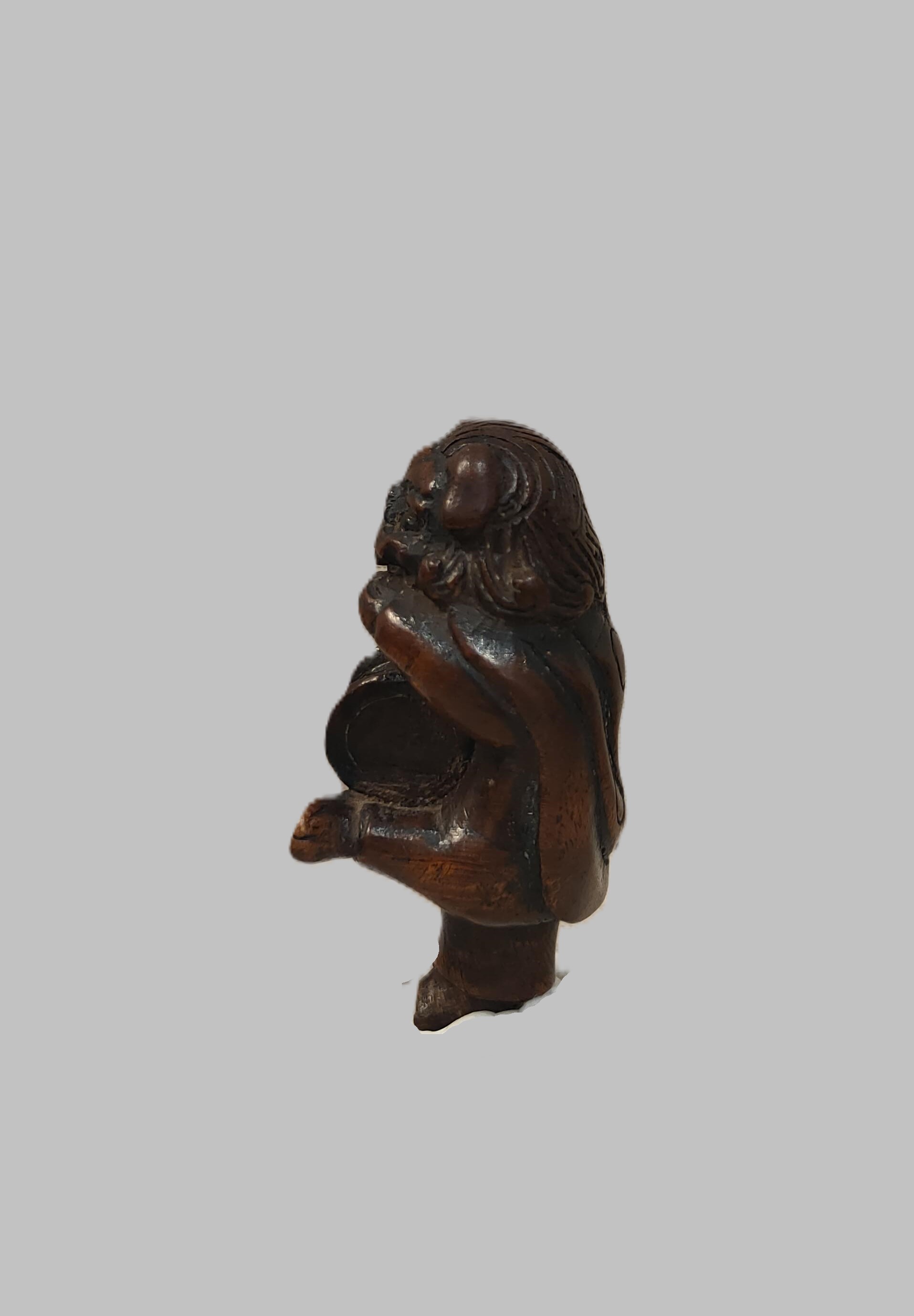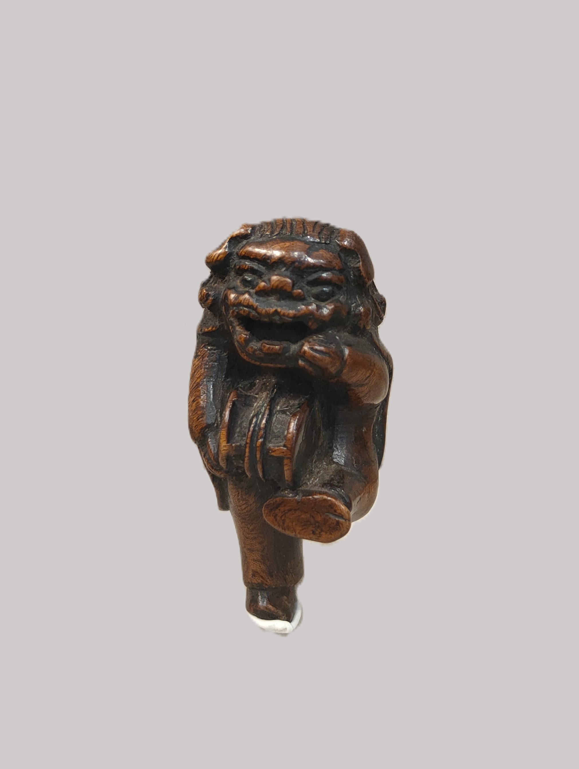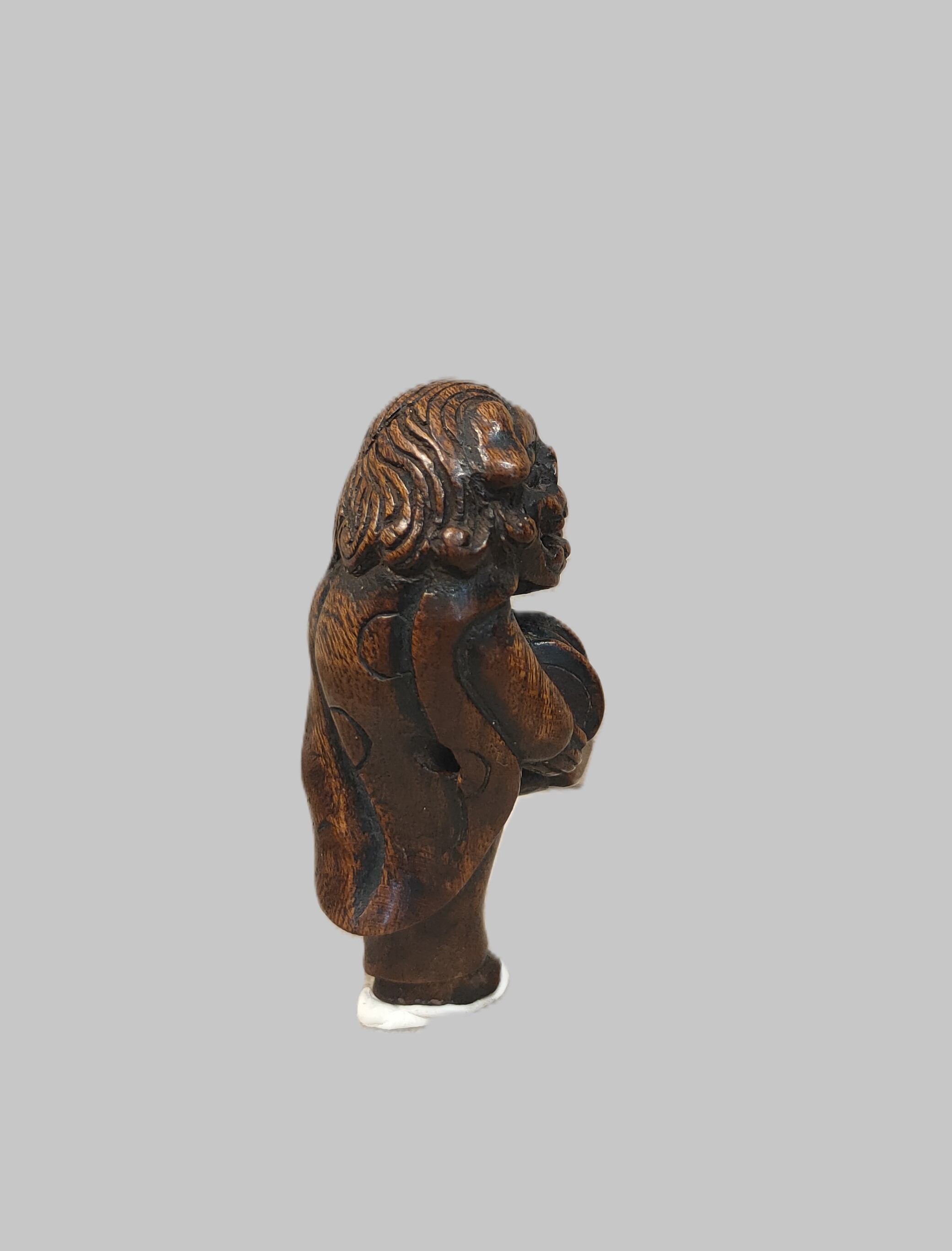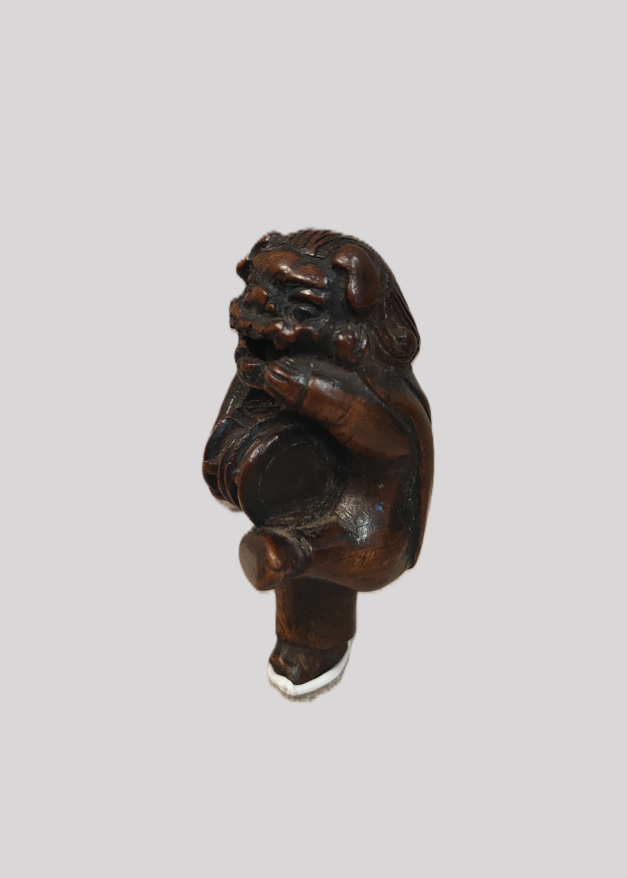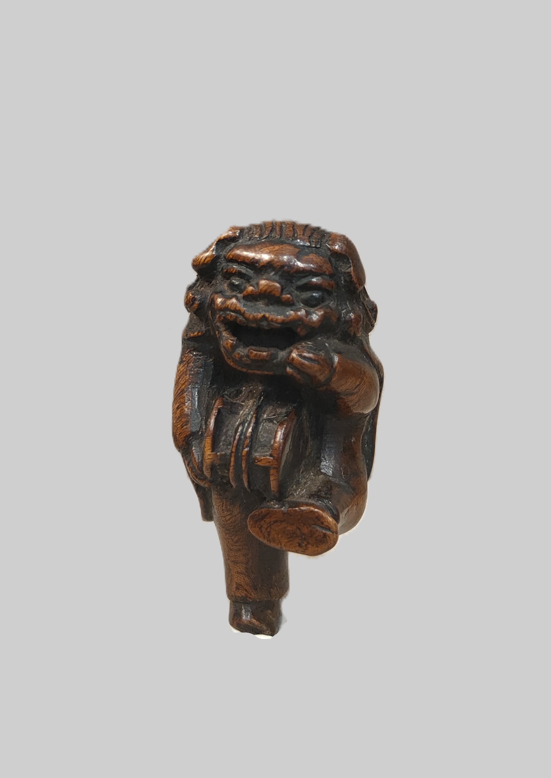 Netsuke en bois sculpté représentant un personnage déguisé pour la danse du Shishimaï tenant dans ses mains un tambour. Hauteur : 6,5 cm. Japon Edo (1603-1868) XIXe siècle