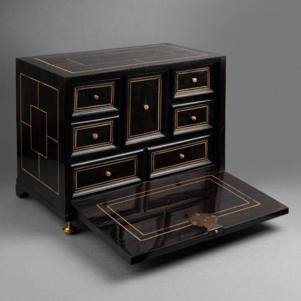 Petit cabinet en placage de palissandre Incrustation d’os en filets. L’abattant ouvrant par une clef découvrant six petits tiroirs dont un double. Bouton de tirage. Piètement en bronze tourné. Piètement postérieur mouluré. Europe, XVIIème siècle Dimensions : 25,5 x 31 x 21 cm