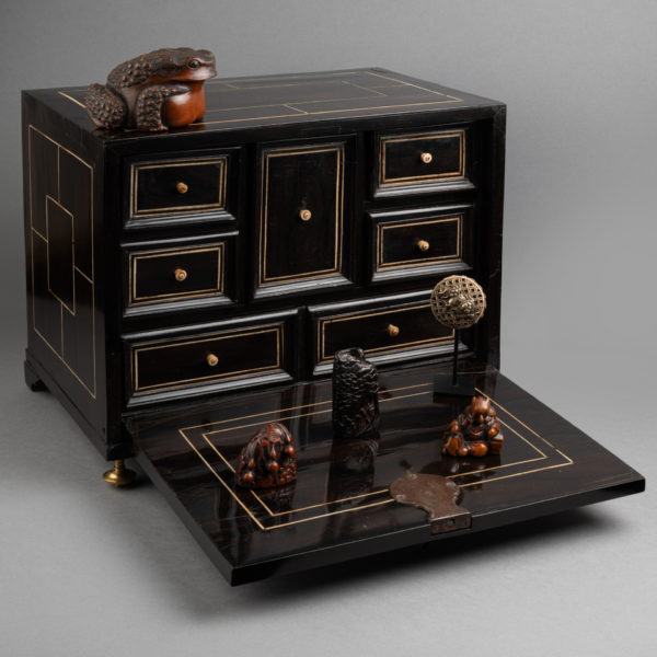Small cabinet in rosewood veneer. Inlaid with fillets. The flap opens with a key revealing six small drawers, one of which is double. Pull knob. Turned bronze base. Molded rear base Europe, 17th century Dimensions: 25.5 x 31 x 21 cm