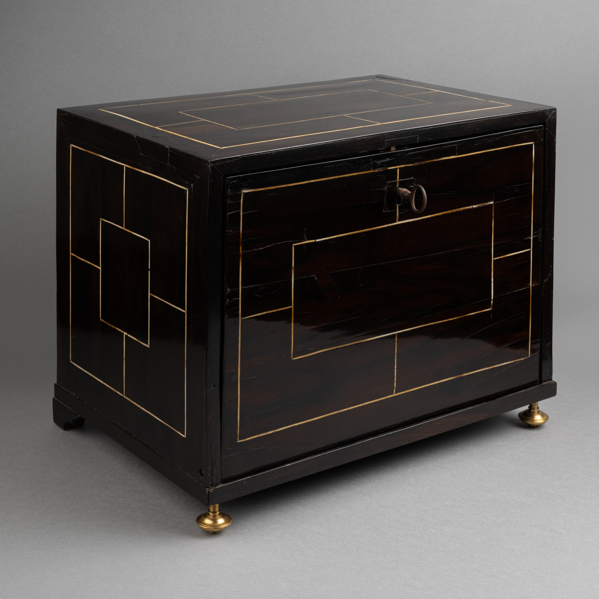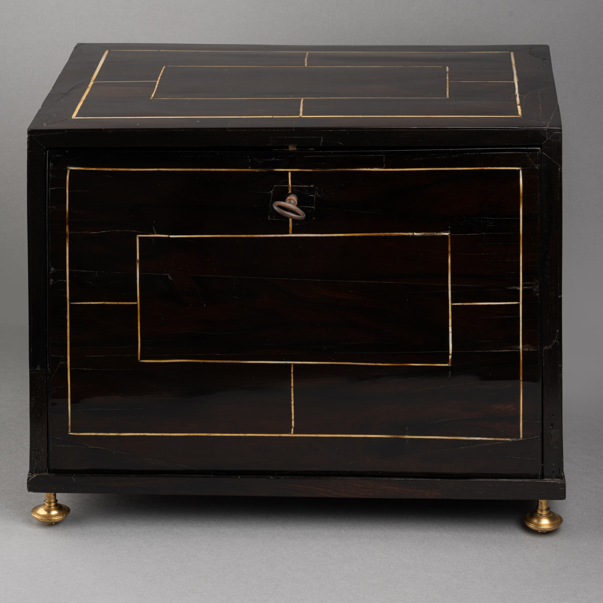Petit cabinet en placage de palissandre Incrustation d’os en filets. L’abattant ouvrant par une clef découvrant six petits tiroirs dont un double. Bouton de tirage. Piètement en bronze tourné. Piètement postérieur mouluré. Europe, XVIIème siècle Dimensions : 25,5 x 31 x 21 cm