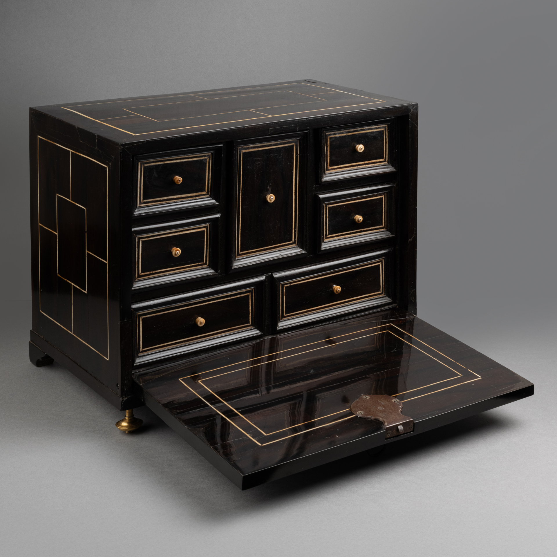 Small cabinet in rosewood veneer. Inlaid with fillets. The flap opens with a key revealing six small drawers, one of which is double. Pull knob. Turned bronze base. Molded rear base Europe, 17th century Dimensions: 25.5 x 31 x 21 cm