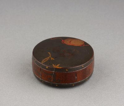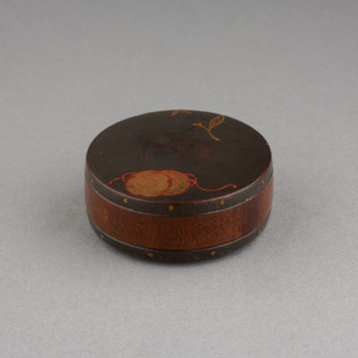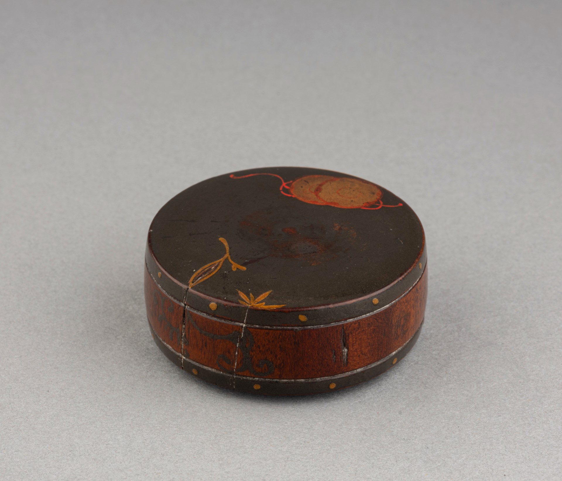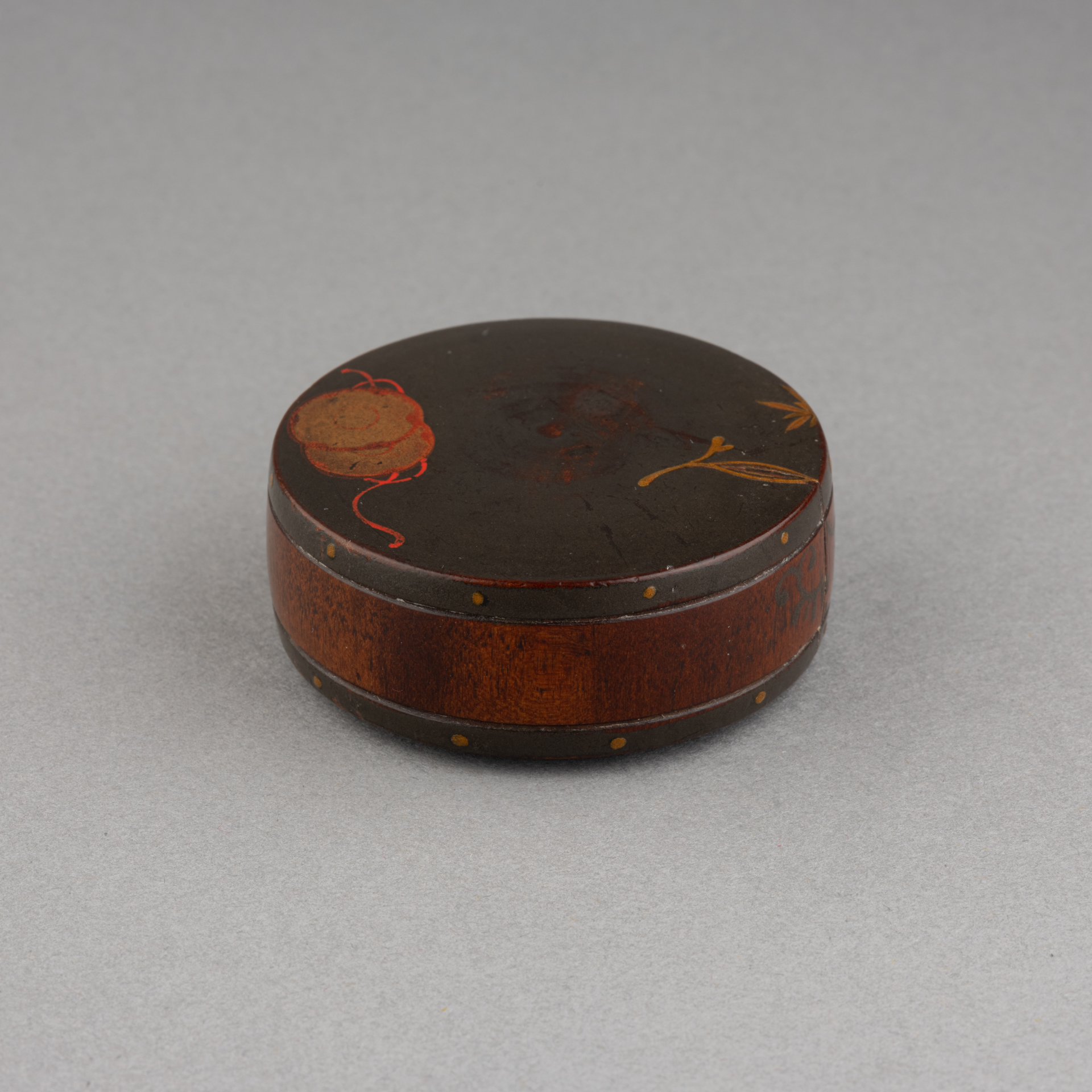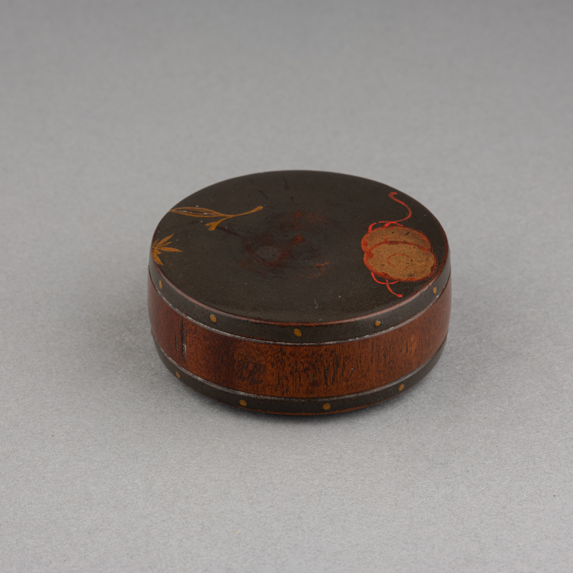 Netsuke – Carved wooden drum Japanese urushi lacquer Grey-blue / silver background decorated with a small golden Japanese drum (Tsuzumi) and foliage. Himotoshi under the base Japan late Edo, 19th century