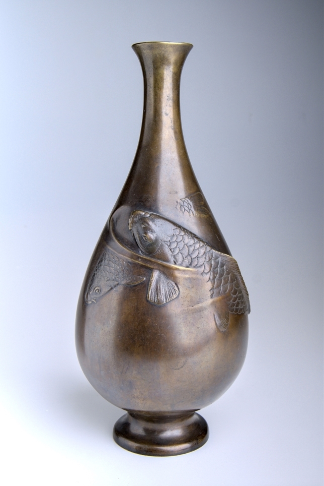 Bronze vase with carps by Shigemasa late 19th century – Meiji period Protruding pair of carps in the center with one of the carps reaching out of the water surface and thereby causing water movement. It crosses the other carp swimming below it. Japan, – Signed. Height 32 cm