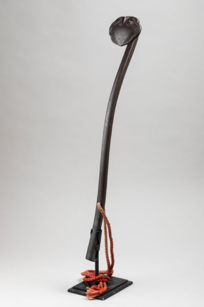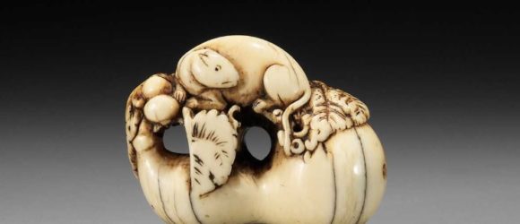 Netsuke – en bois sculpté, représentant un rat grimpant sur une tête de saumon séché, (shiozake), plat classique du Nouvel An japonais (Shogatsu). Le poisson est sculpté est présenté la gueule ouverte, révélant les dents à l’intérieur, et le rat bien assis s’apprête à se délecter de son butin. Revers orné d’un Himotoshi. Les yeux sont incrustés de corne brune. Période Edo (1615-1868) Japon, 19e siècle.