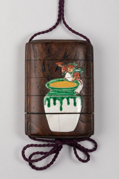 Inro par Kakosai Shozan – Rare et important Inro, ouvrant par 4 cases et un couvercle, en laque d’or urushi, représentant des rats près de grosses balles de riz. Fond or en kinji magnifiquement poli et lustré et riches incrustations de nacre dans la représentation des rats en haut relief, les balles et les graines de takamakie et l’intérieur de nashiji. Sujet associé au dieu Daikoku. Ojime en bois doré assorti. Signé Kakosai Shozan. Hauteur : 10 cm x Longueur 6,2 cm. Exceptionnelle qualité de laque et de sculpture. Japon, Edo (1615-1868) début du XIXe siècle. Provenance : Collection Hartman, USA. Le décor peut être mis en rapprochement avec un Egoyomi, 1790–1795, Brooklyn Museum et une œuvre de Katsushika Hokusai, 1843.