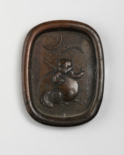 Netsuke par Kokei – Exceptionnel modèle d’un loup, la patte retenant un crâne. Les yeux sont en double incrustation. Japon Edo (1603-1968) XIXe siècle. Longueur : 4,5 cl. Provenance : Collection Hartman. Mise en comparaison avec une pièce similaire de même qualité (ci-dessous), dont le crâne est manquant. Il s’agit d’une œuvre de Kokei située au MET de New York, Edward C.MOORE collection, 1891.