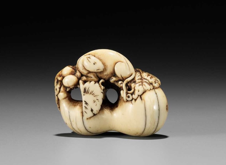 NETSUKE – Rare et très élégant modèle de netsuke, représentant un rongeur sur une calebasse avec son feuillage sculpté. Belle couleur et patine naturelle. Longueur : 4,3 cm. Japon EDO (1603-1868) XVIIIe siècle
