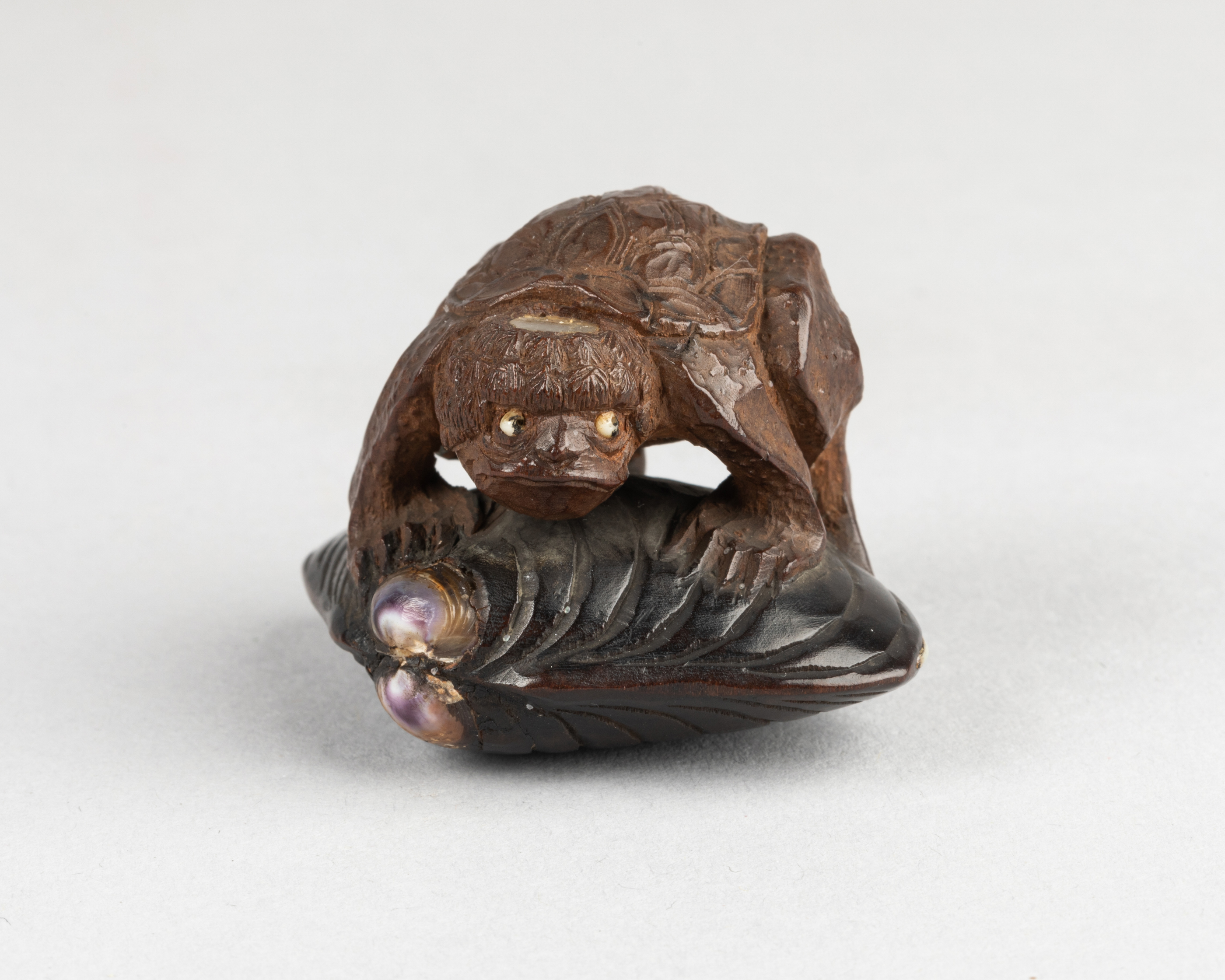 Netsuke – Tortues par Komin. Un groupe de 3 tortues, l’une formant la base, les deux autres grimpant l’une sur l’autre. Chaque carapace et autres détails sont très finement sculptés. Très belle couleur du bois et jolie patine naturelle. Signé Gyokumin dans une réserve sous la base. Les himotoshi sont cerclés d’os. 3 x 3,5 cm. Japon, Ecole de Tokyo. Edo (1603-1868) 19e siècle.