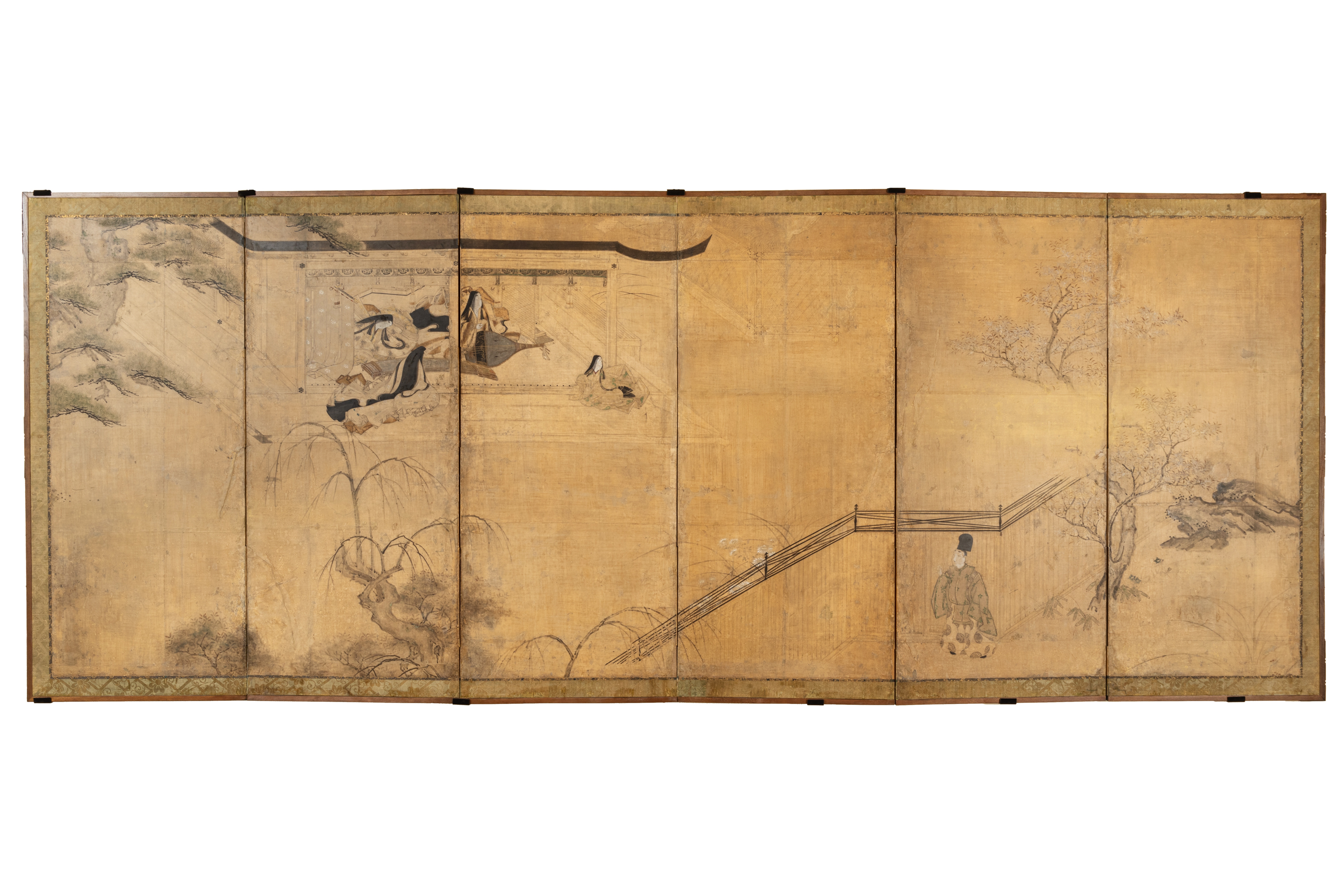 A small model of an japanese urushi gold lacquer Inro. Technique of hiramaki-e and kirigane of a beautiful landscape with montains, pine trees and pavillons on a lake, on a gold gold back-ground. Signed Kajikawa. Nashiji lacquer inside. Height : 6,1 cm. Japan Edo (1603-1868) end of 18th century. An old label from a sale n°105 and a old label from a collection n°60.